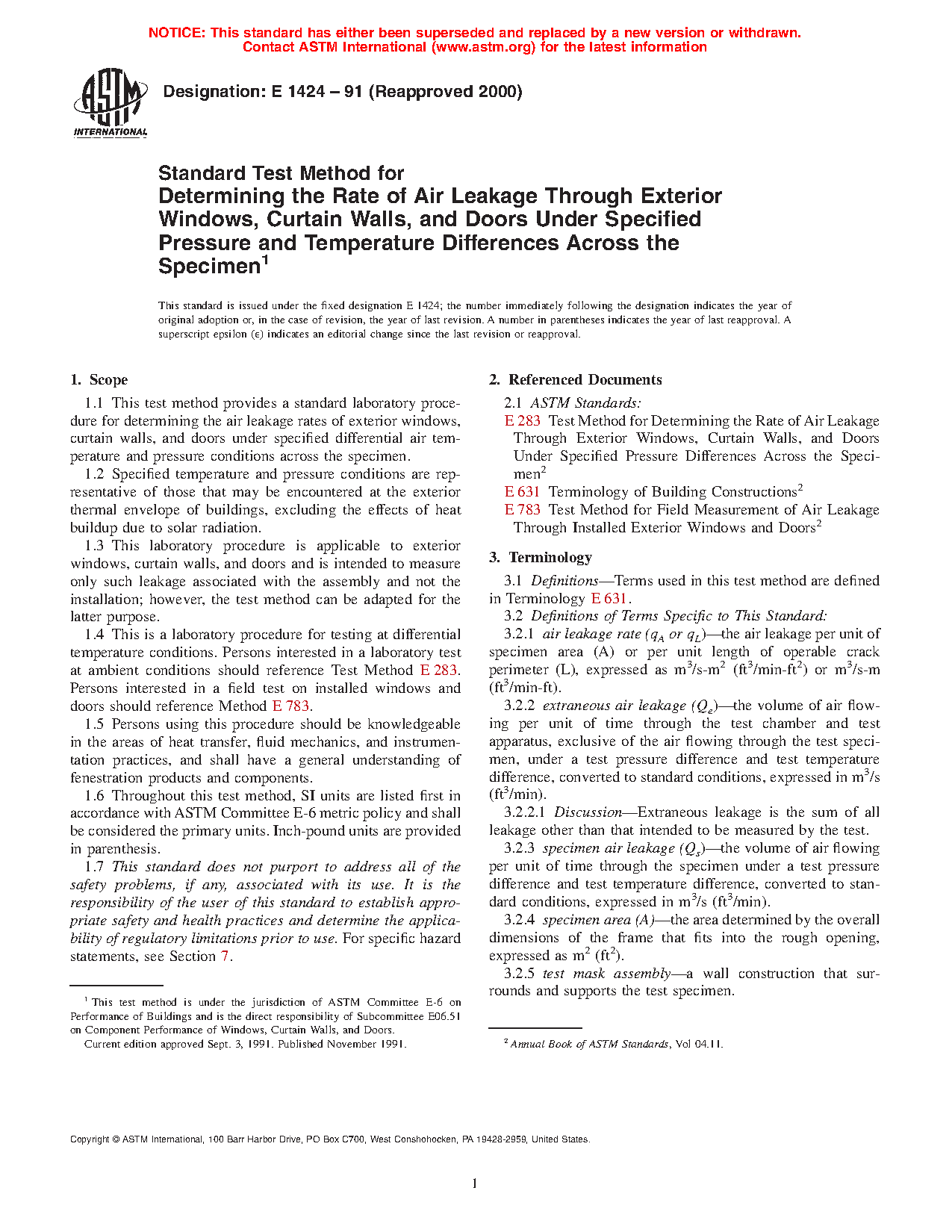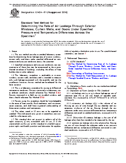1.1 This test method provides a standard laboratory procedure for determining the air leakage rates of exterior windows, curtain walls, and doors under specified differential air temperature and pressure conditions across the specimen.
