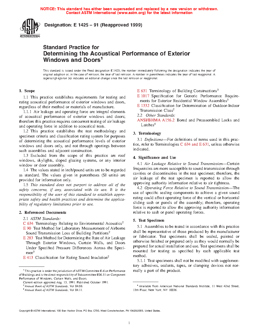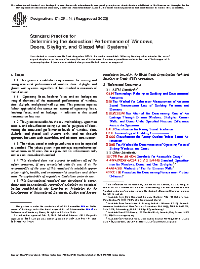 1.2 This practice establishes the test methodology, specimen criteria, and classification rating system for purposes of determining the acoustical performance levels of window, door, skylight, and glazed wall systems only, and not through openings between such assemblies and adjacent construction.