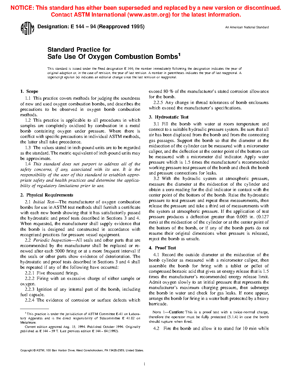 This practice covers methods for judging the soundness of new and used oxygen combustion bombs, and describes the precautions to be observed in oxygen bomb combustion methods. This practice is applicable to all procedures in which samples are completely oxidized by combustion in a metal bomb containing oxygen under pressure. Hydrostatic test and proof test shall be performed. The following precautions shall be observed in all oxygen bomb combustion methods: sample weight; oxygen filling system; ignition system; and safety barricade.