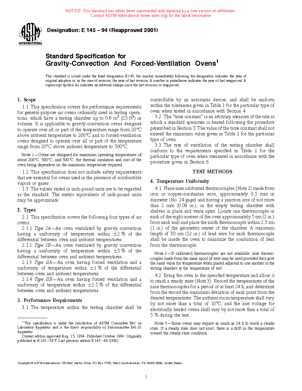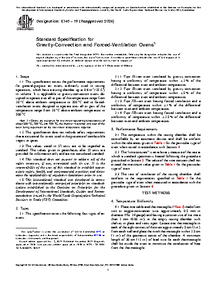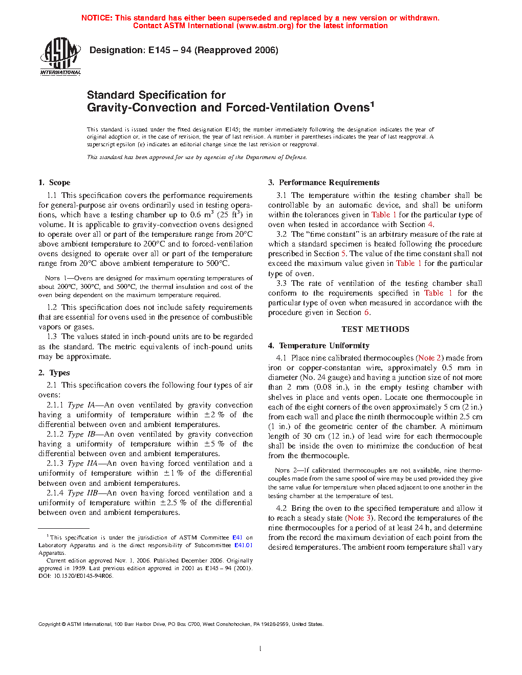 This specification covers the performance requirements for four types (Types IA, IB, IIA, and IIB) of general-purpose air ovens of the gravity-convection and forced-ventilation types ordinarily used in testing operations. The temperature within the testing chamber shall be controllable by an automatic device and, when examined with appropriate test methods provided herein, shall be uniform within the tolerances for temperature uniformity, time constant, and rate of ventilation requirements for the particular type of oven.