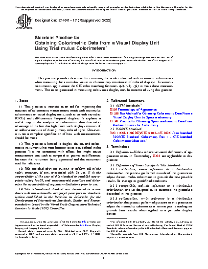 1.1 This practice is intended as an aid for improving the accuracy of colorimetric measurements made with tristimulus colorimeters on visual display units, such as cathode ray tubes (CRTs) and self-luminous flat-panel displays. It explains a useful step in the analysis of colorimetric data that takes advantage of the fact that light from such displays consists of an additive mixture of three primary colored lights. However, it is not a complete specification of how such measurements should be made.