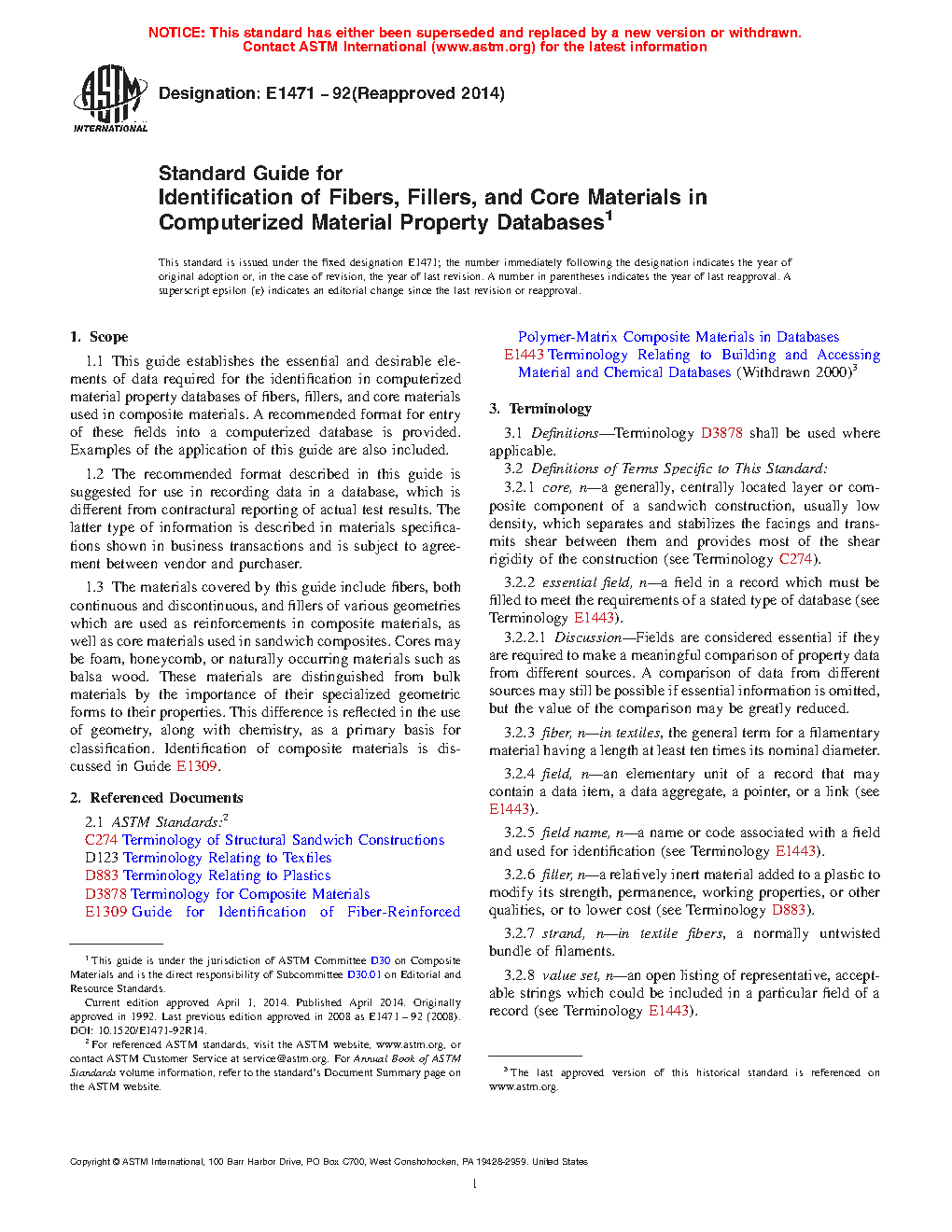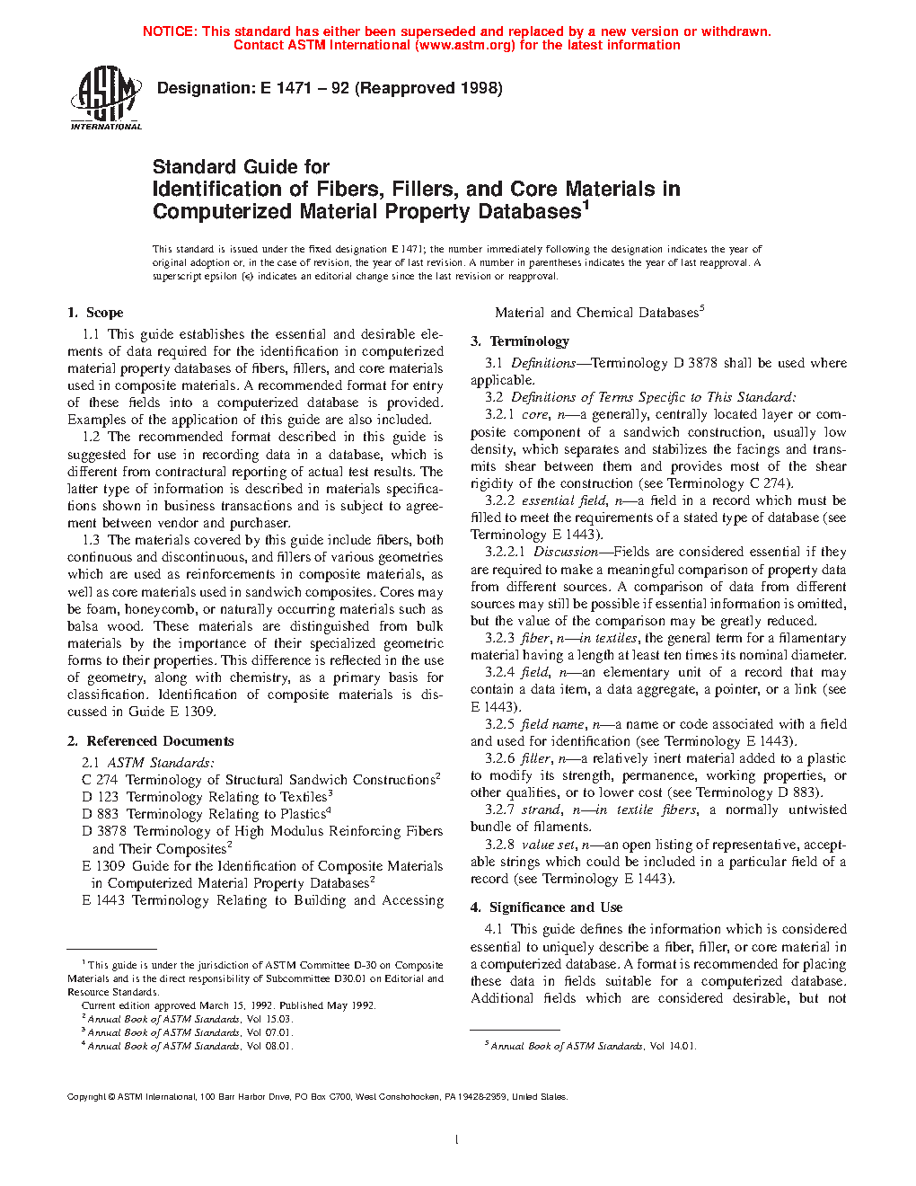 1.1 This guide establishes the essential and desirable elements of data required for the identification in computerized material property databases of fibers, fillers, and core materials used in composite materials. A recommended format for entry of these fields into a computerized database is provided. Examples of the application of this guide are also included.
