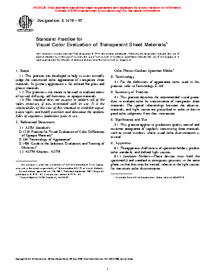 1.1 This practice was developed to help its users critically judge the transmitted color appearance of transparent sheet materials. Its primary application is for colored flat glass and plastic materials.