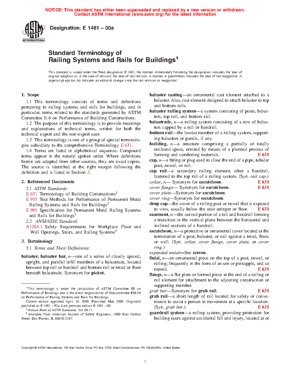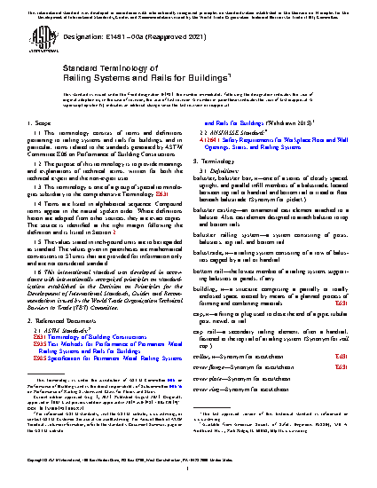 1.1 This terminology consists of terms and definitions pertaining to railing systems and rails for buildings, and in particular, terms related to the standards generated by ASTM Committee E06 on Performance of Building Constructions.