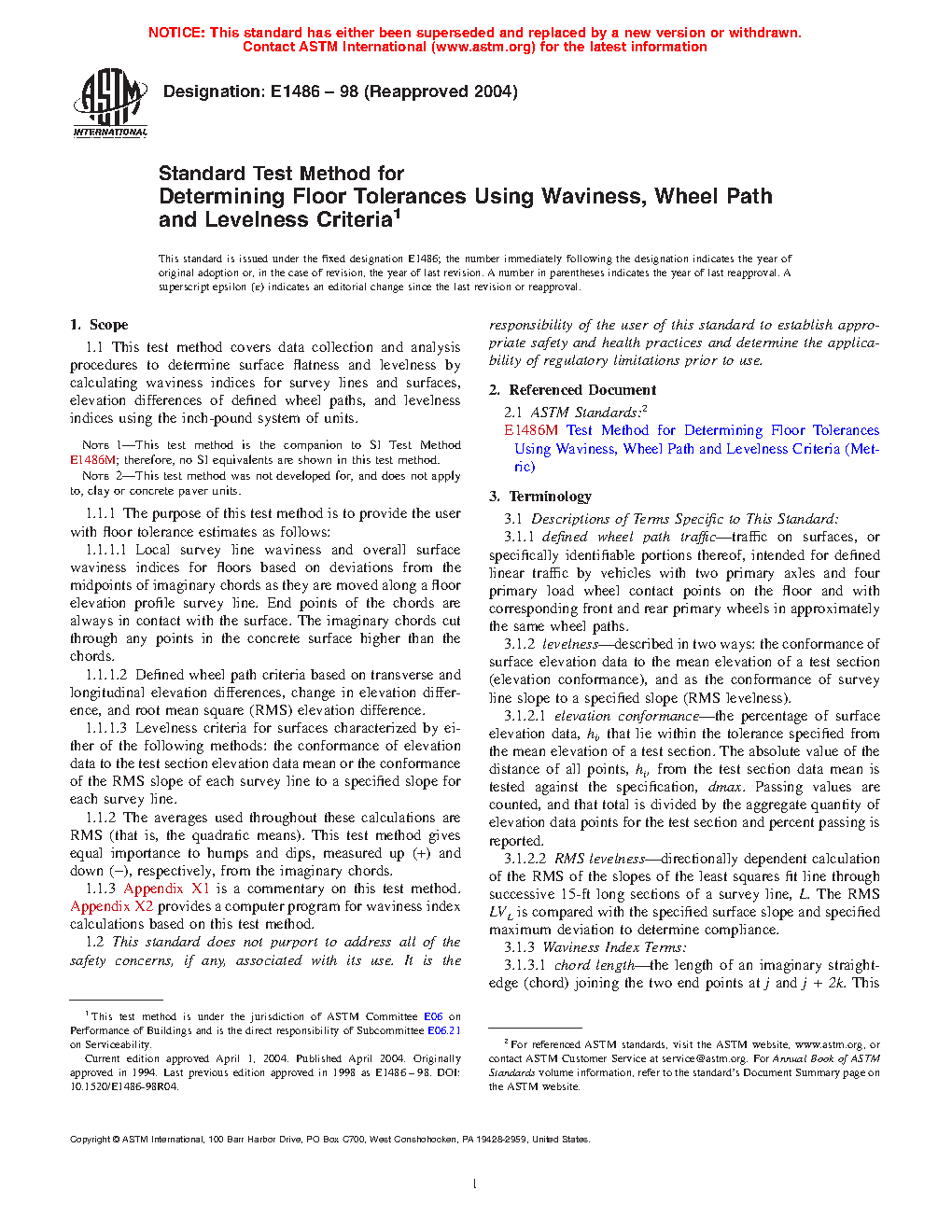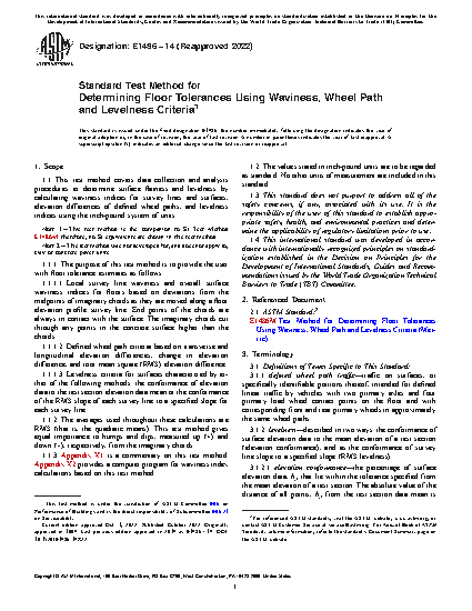1.1 This test method covers data collection and analysis procedures to determine surface flatness and levelness by calculating waviness indices for survey lines and surfaces, elevation differences of defined wheel paths, and levelness indices using the inch-pound system of units.