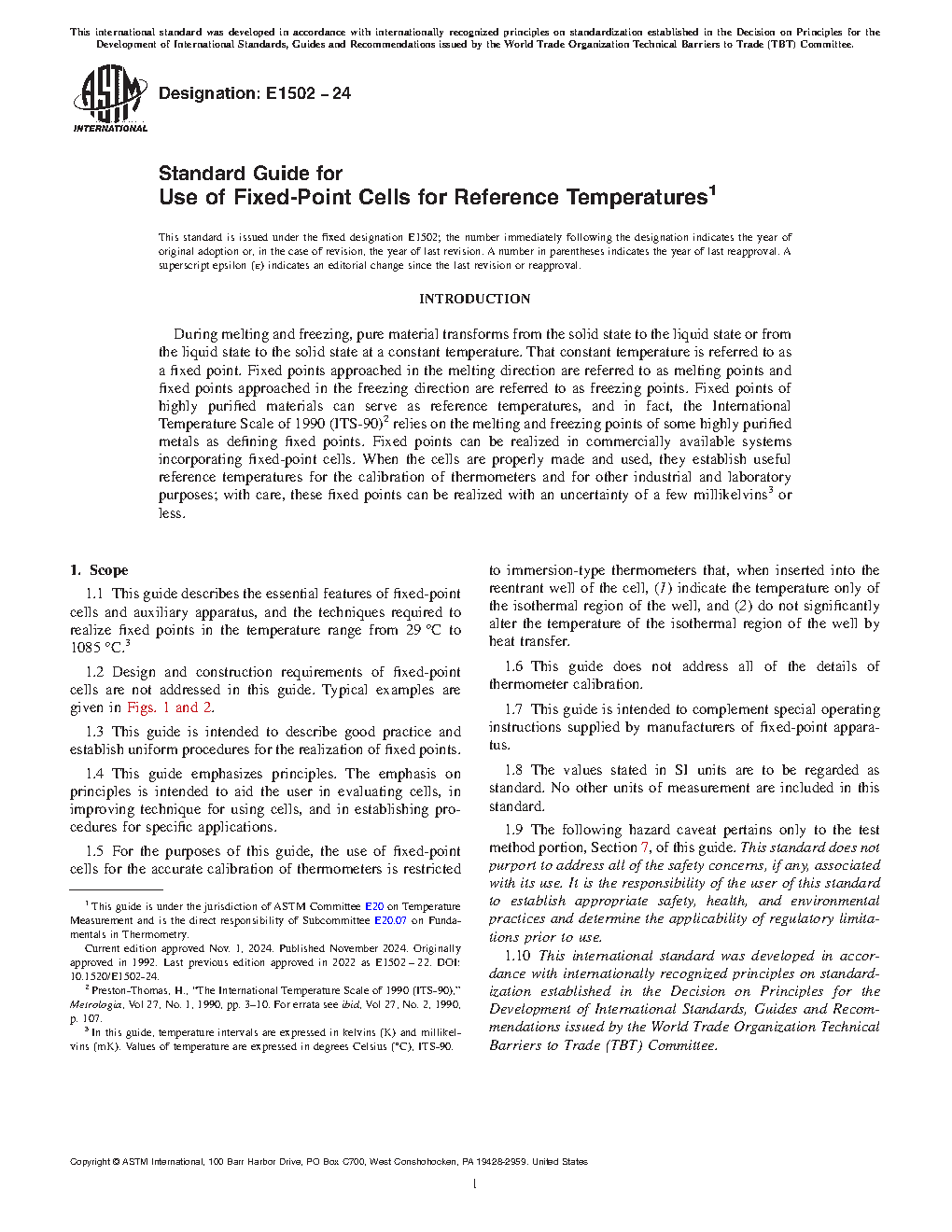 1.1 This guide describes the essential features of fixed-point cells and auxiliary apparatus, and the techniques required to realize fixed points in the temperature range from 29 to 1085°C.