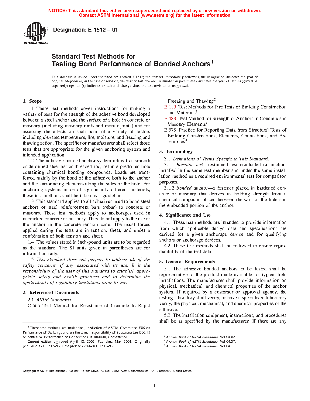 1.1 These test methods cover instructions for making a variety of tests for the strength of the adhesive bond developed between a steel anchor and the surface of a hole in concrete or masonry (including masonry units and mortar joints) and for assessing the effects on such bond of a variety of factors including elevated temperature, fire, moisture, and freezing and thawing action. The specifier or manufacturer shall select those tests that are appropriate for the given anchoring system and intended application.