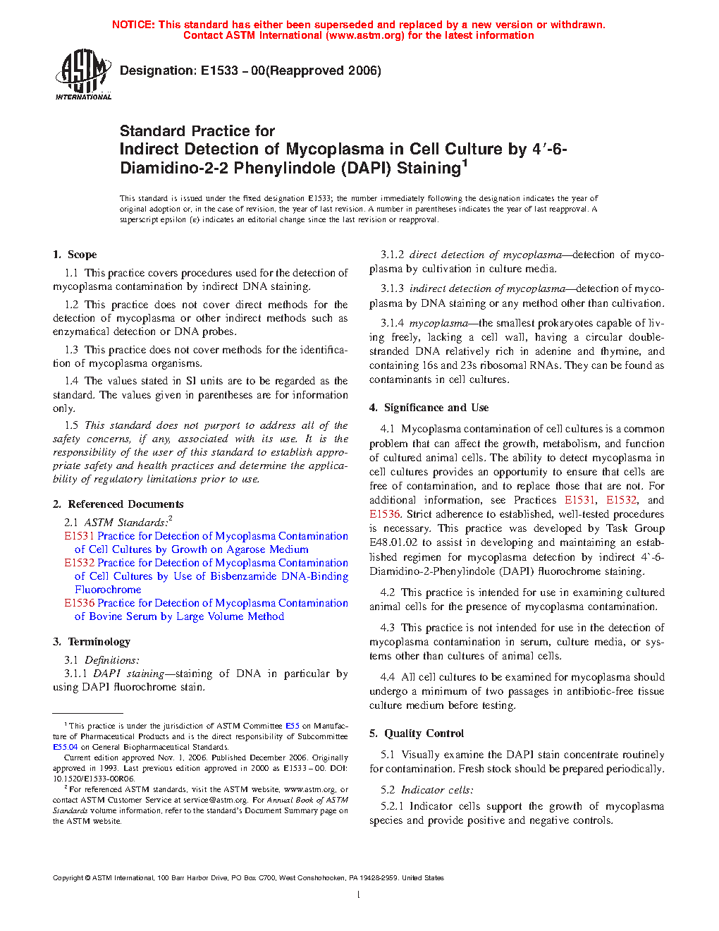 1.1 This practice covers procedures used for the detection of mycoplasma contamination by indirect DNA staining.