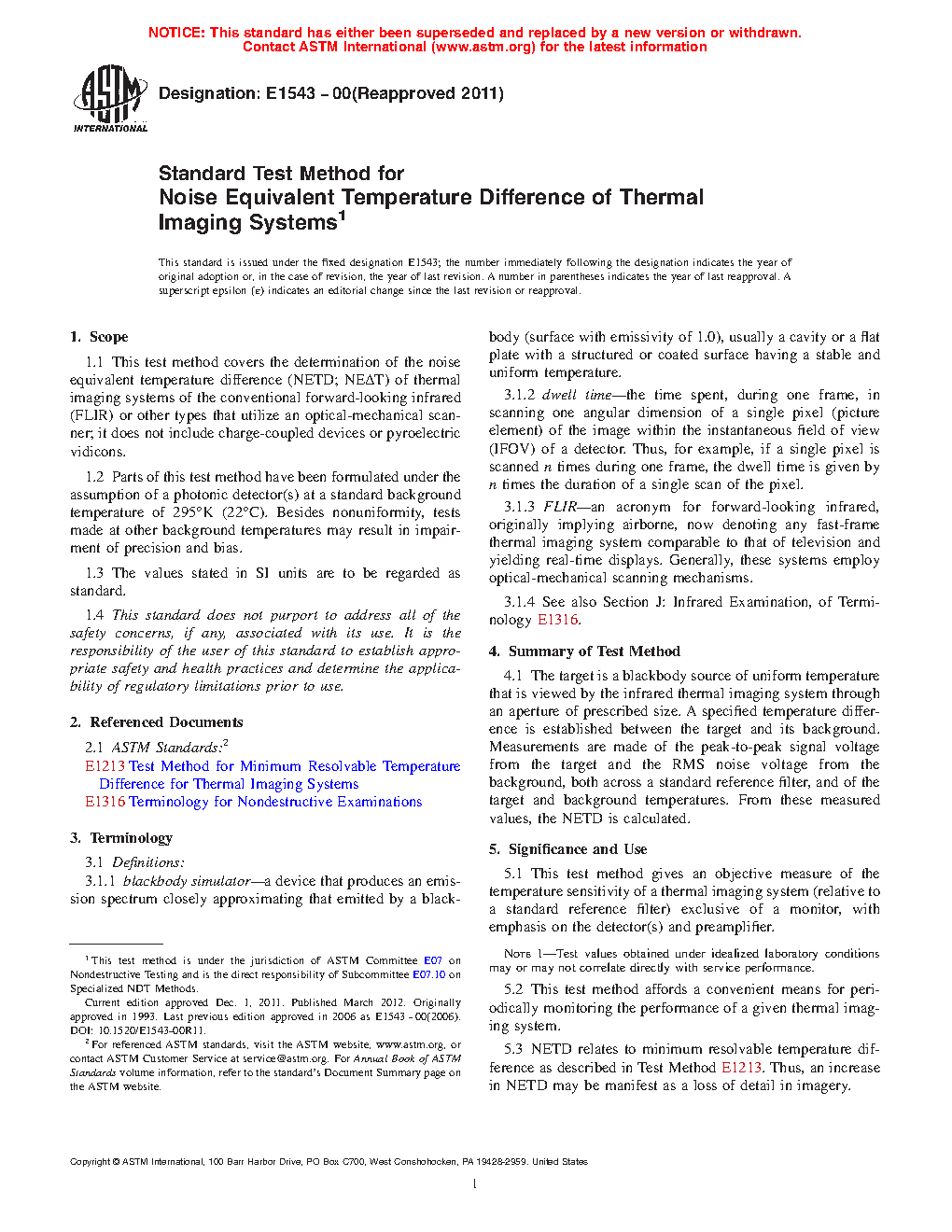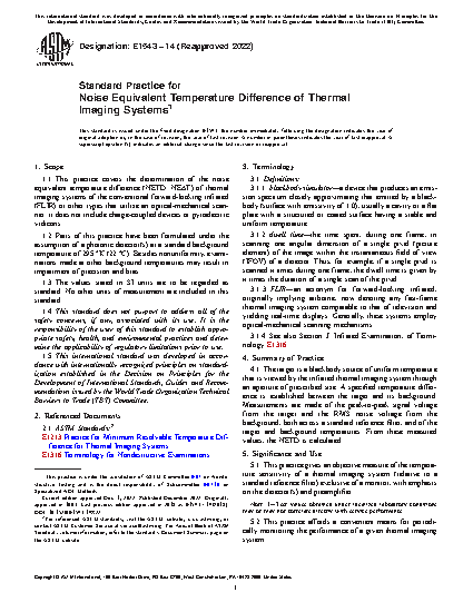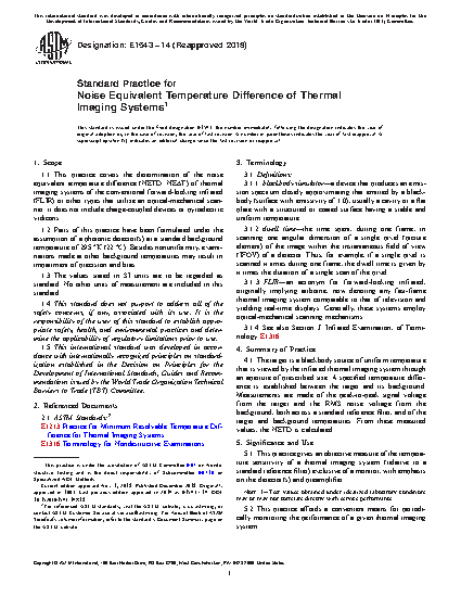 1.1 This test method covers the determination of the noise equivalent temperature difference (NETD; NE[delta]T) of thermal imaging systems of the conventional forward-looking infrared (FLIR) or other types that utilize an optical-mechanical scanner; it does not include charge-coupled devices or pyroelectric vidicons.