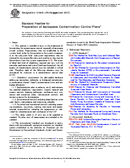 1.1 This practice is intended to assist in the preparation of formal plans for contamination control, especially of aerospace critical surfaces. Requirements may be established at the systems level, either by the customer or the systems integrator, or at the subsystem level. Subsystem requirements may be imposed by the responsible subsystem supplier or they may be flowed down from the systems organization (4.7). The extent of detail and level of cleanliness required can vary with the particular application and type of hardware being built, but all aspects of contamination control must be included in a final plan. Therefore, each of the following elements must be considered for inclusion in a contamination control plan (CCP):
