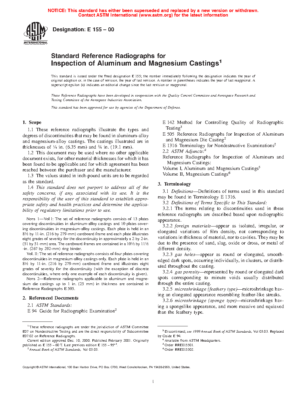 Note 1: Vol I: The set of reference radiographs consists of 13 plates covering discontinuities in aluminum-alloy castings and 10 plates covering discontinuities in magnesium-alloy castings. Each plate is held in an 81/2 by 11 in. (216 by 279 mm) cardboard frame and each plate illustrates eight grades of severity for the discontinuity in approximately a 2 by 2 in. (51 by 51 mm) area. The cardboard frames are contained in a 101/2 by 111/2 in. (267 by 292 mm) ring binder. The reference radiographs are not impacted by this revision. There have been no revisions to the adjunct reference radiographs since original issue. The adjunct reference radiographs of any issue remain valid and may be used to this standard.