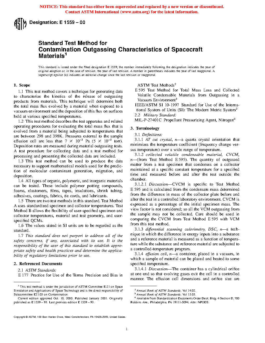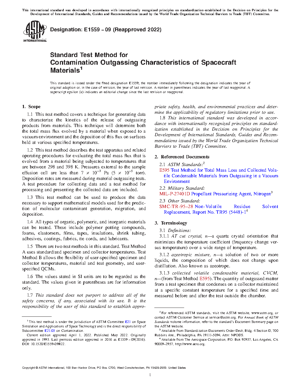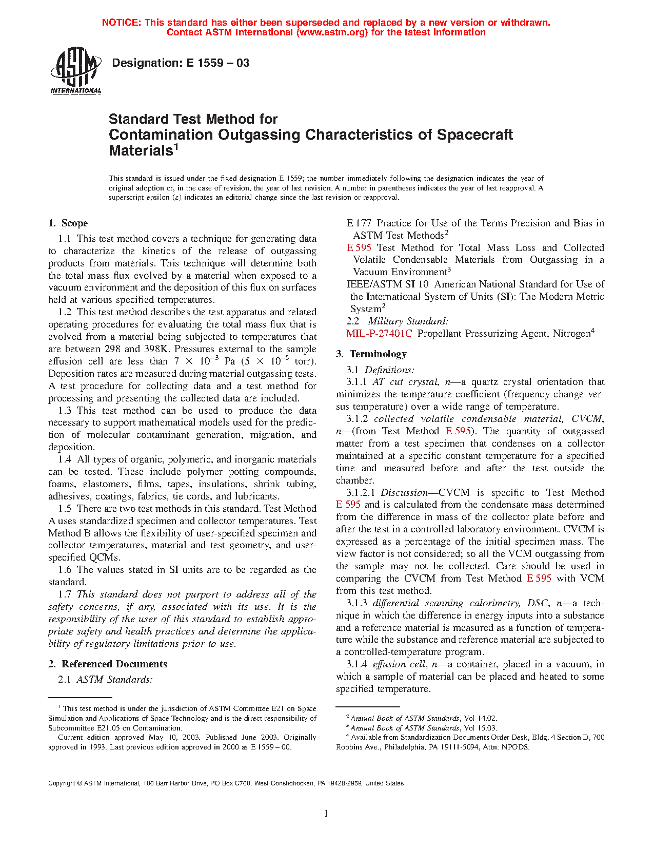 1.4 All types of organic, polymeric, and inorganic materials can be tested. These include polymer potting compounds, foams, elastomers, films, tapes, insulations, shrink tubing, adhesives, coatings, fabrics, tie cords, and lubricants.