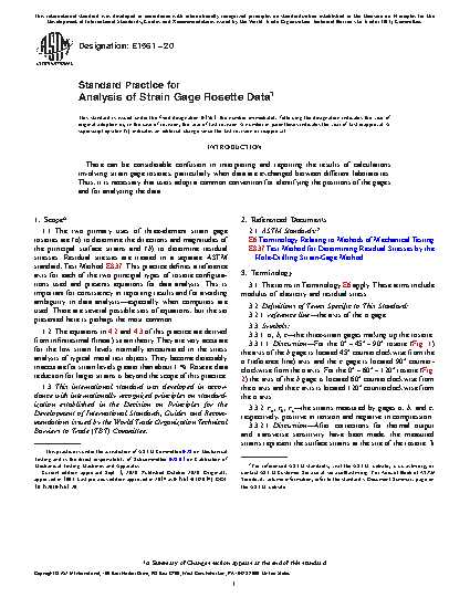 1.1 The two primary uses of three-element strain gage rosettes are (a) to determine the directions and magnitudes of the principal surface strains and (b) to determine residual stresses. Residual stresses are treated in a separate ASTM standard, Test Method E837. This practice defines a reference axis for each of the two principal types of rosette configurations used and presents equations for data analysis. This is important for consistency in reporting results and for avoiding ambiguity in data analysis-especially when computers are used. There are several possible sets of equations, but the set presented here is perhaps the most common.