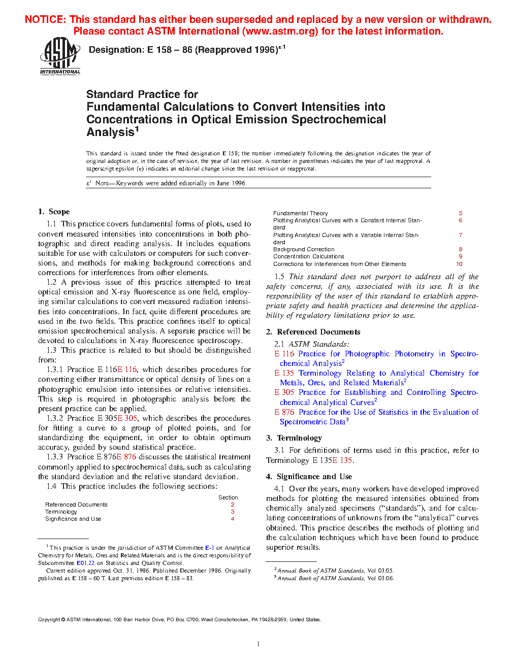 Section Referenced Documents 2 Terminology 3 Significance and Use 4 Fundamental Theory 5 Plotting Analytical Curves with a Constant Internal Standard 6 Plotting Analytical Curves with a Variable Internal Standard 7 Background Correction 8 Concentration Calculations 9 Corrections for Interferences from Other Elements 101.5 This standard does not purport to address all of the safety concerns, if any, associated with its use. It is the responsibility of the user of this standard to establish appropriate safety and health practices and determine the applicability of regulatory limitations prior to use.
