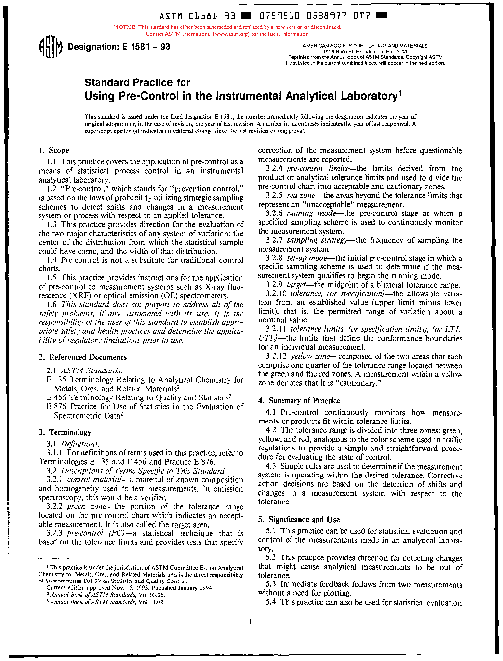 Practice for Using Pre-Control in the Instrumental/Analytical Laboratory (Withdrawn 1998)