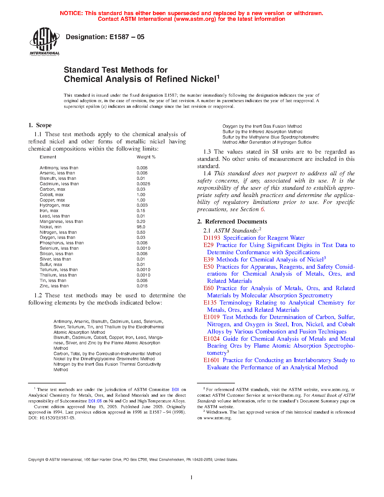 1.1 These test methods apply to the chemical analysis of refined nickel and other forms of metallic nickel having chemical compositions within the following limits: