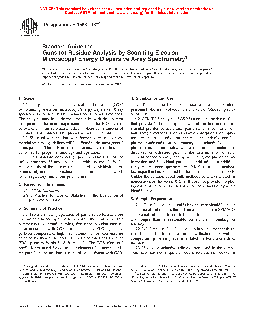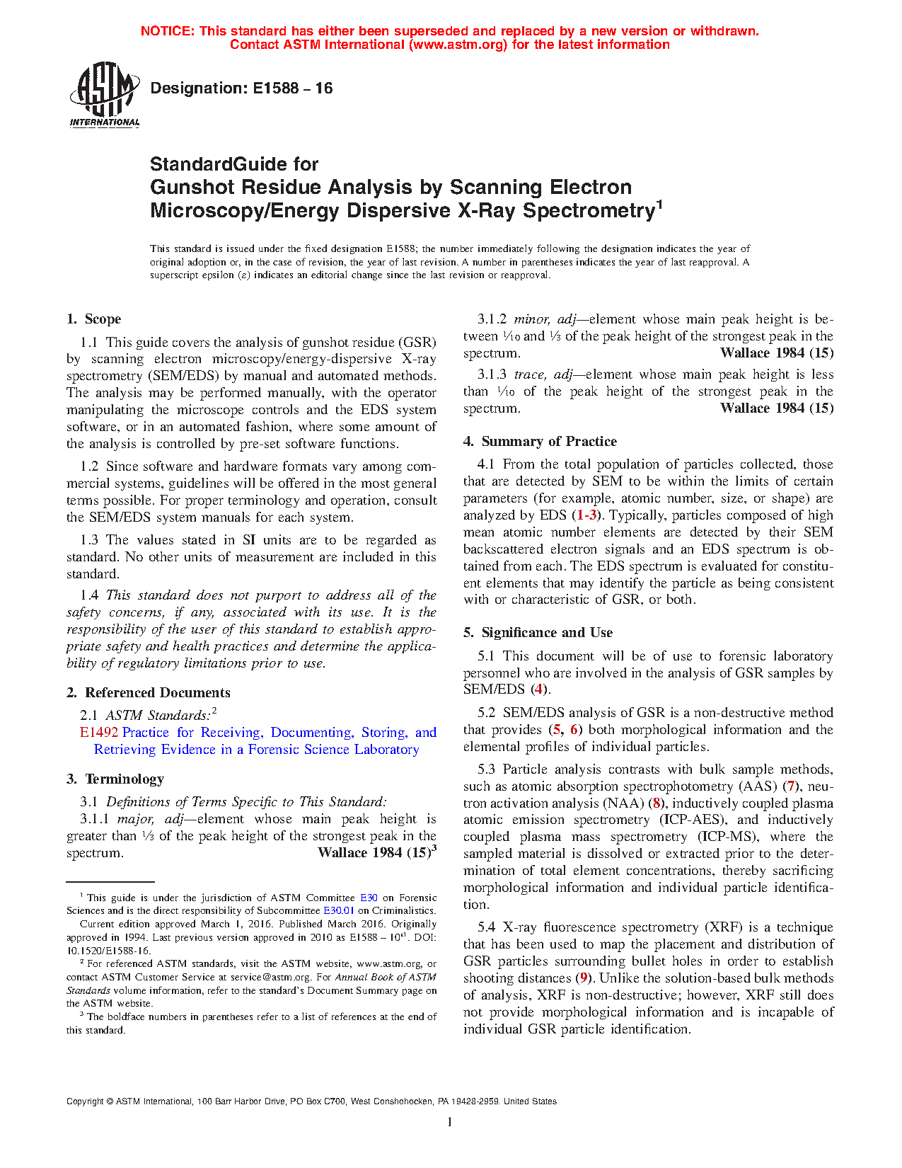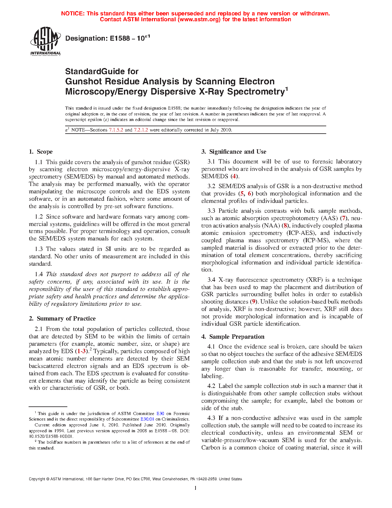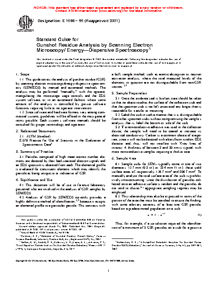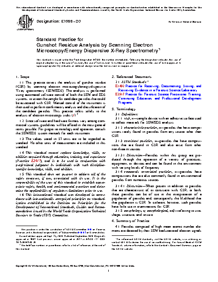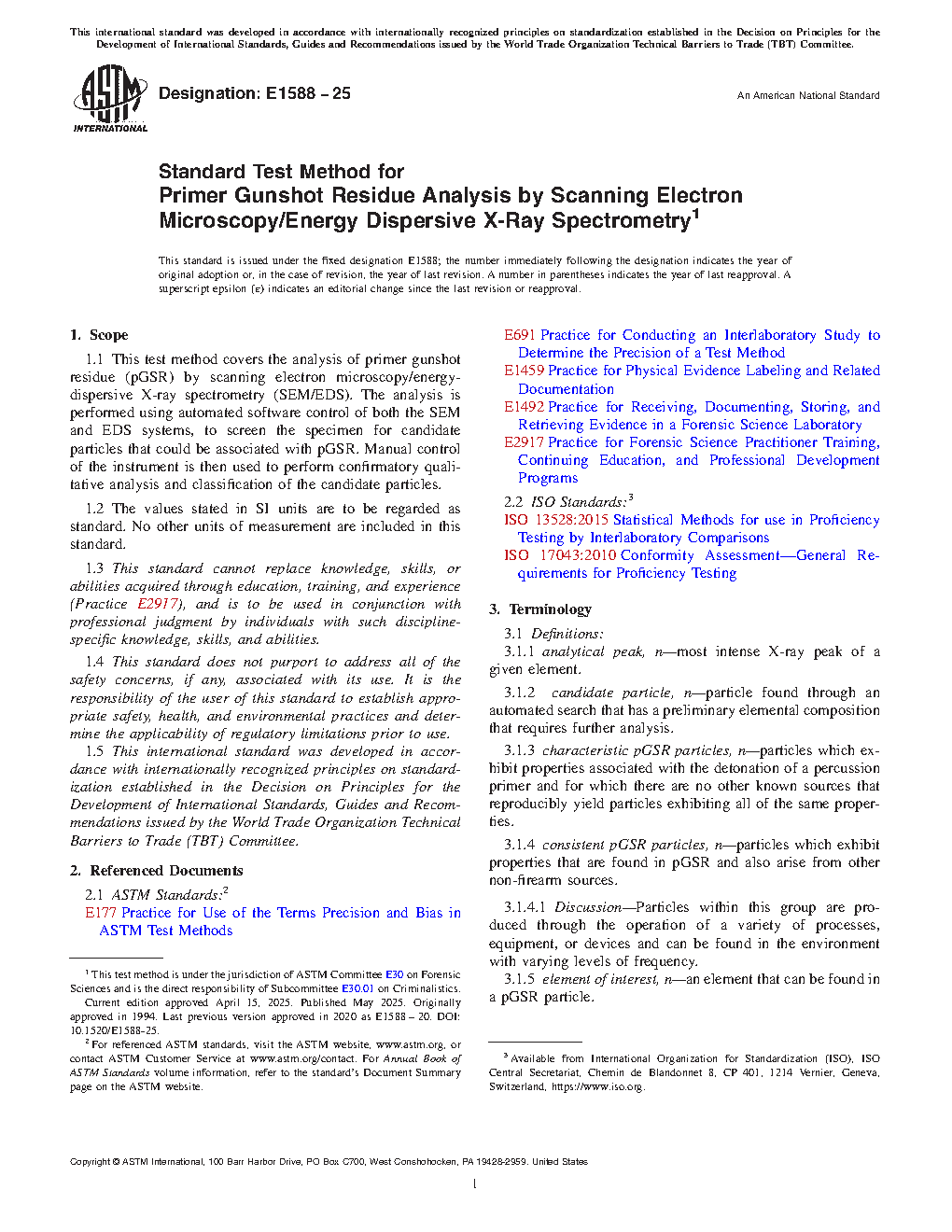 1.1 This test method covers the analysis of primer gunshot residue (pGSR) by scanning electron microscopy/energy-dispersive X-ray spectrometry (SEM/EDS). The analysis is performed using automated software control of both the SEM and EDS systems, to screen the specimen for candidate particles that could be associated with pGSR. Manual control of the instrument is then used to perform confirmatory qualitative analysis and classification of the candidate particles.