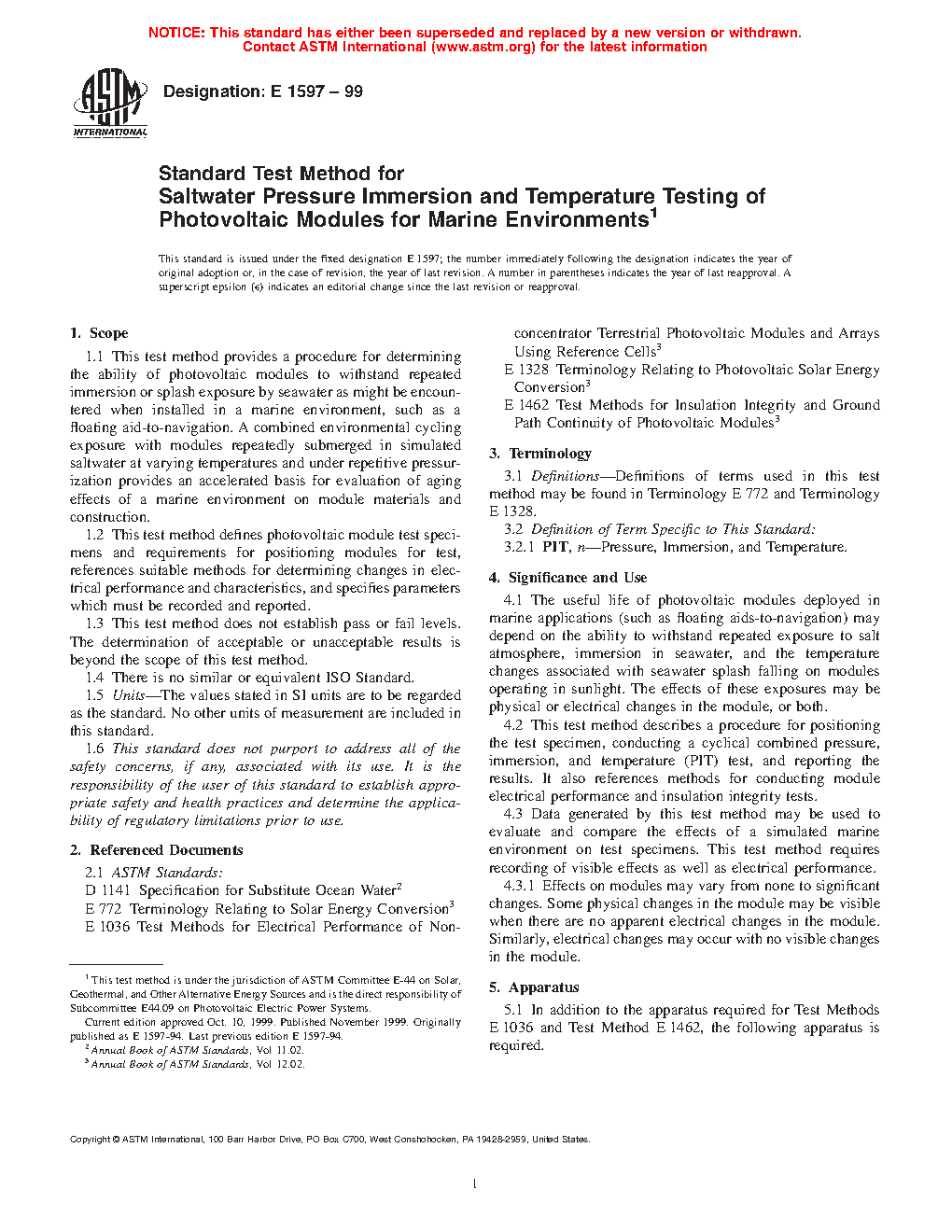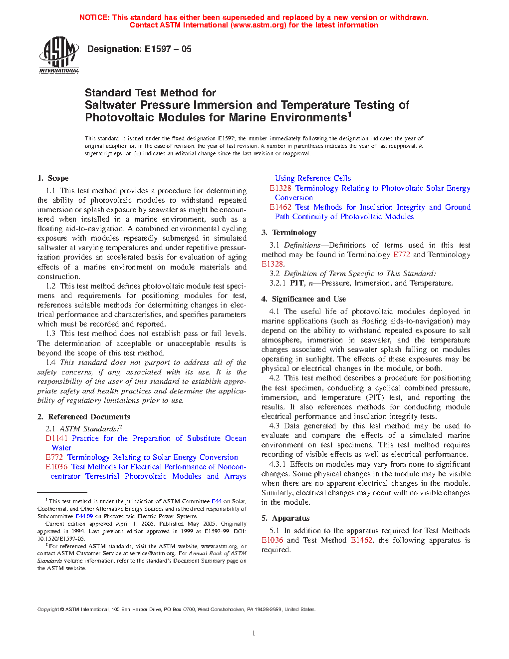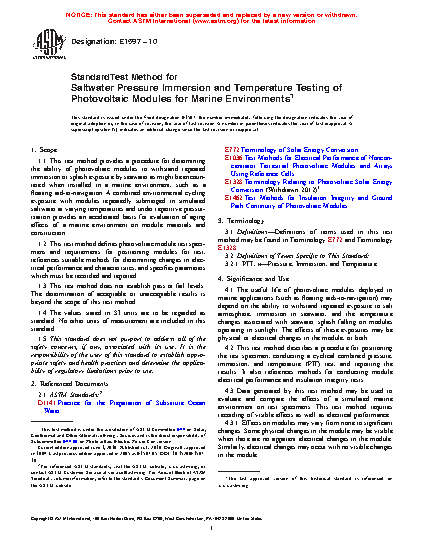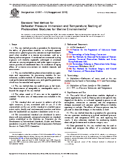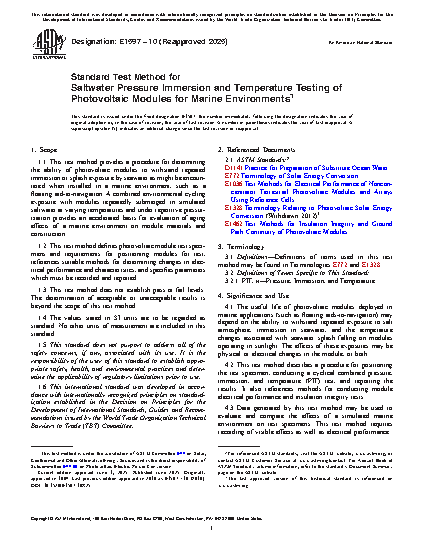 1.1 This test method provides a procedure for determining the ability of photovoltaic modules to withstand repeated immersion or splash exposure by seawater as might be encountered when installed in a marine environment, such as a floating aid-to-navigation. A combined environmental cycling exposure with modules repeatedly submerged in simulated saltwater at varying temperatures and under repetitive pressurization provides an accelerated basis for evaluation of aging effects of a marine environment on module materials and construction.