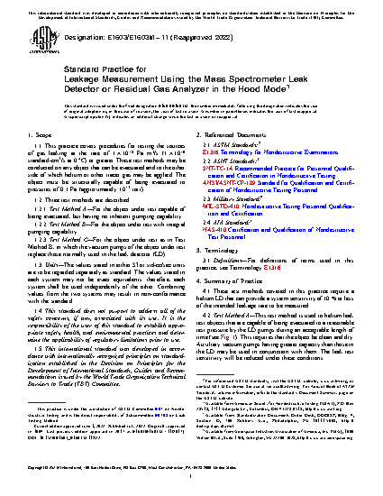 1.1 This practice covers procedures for testing the sources of gas leaking at the rate of 1 × 10 −8 Pa m3/s (1 × 10−9 standard-cm3/s at 0°C) or greater. These test methods may be conducted on any object that can be evacuated and to the other side of which helium or other tracer gas may be applied. The object must be structurally capable of being evacuated to pressures of 0.1 Pa (approximately 10−3 torr).