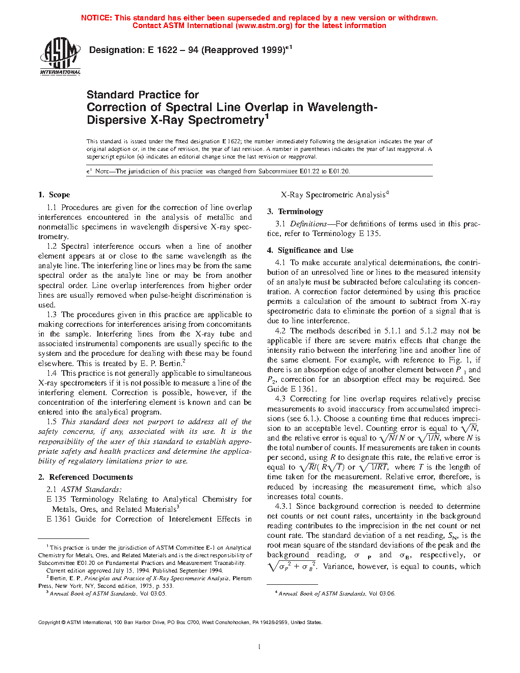 1.1 Procedures are given for the correction of line overlap interferences encountered in the analysis of metallic and nonmetallic specimens in wavelength dispersive X-ray spectrometry.