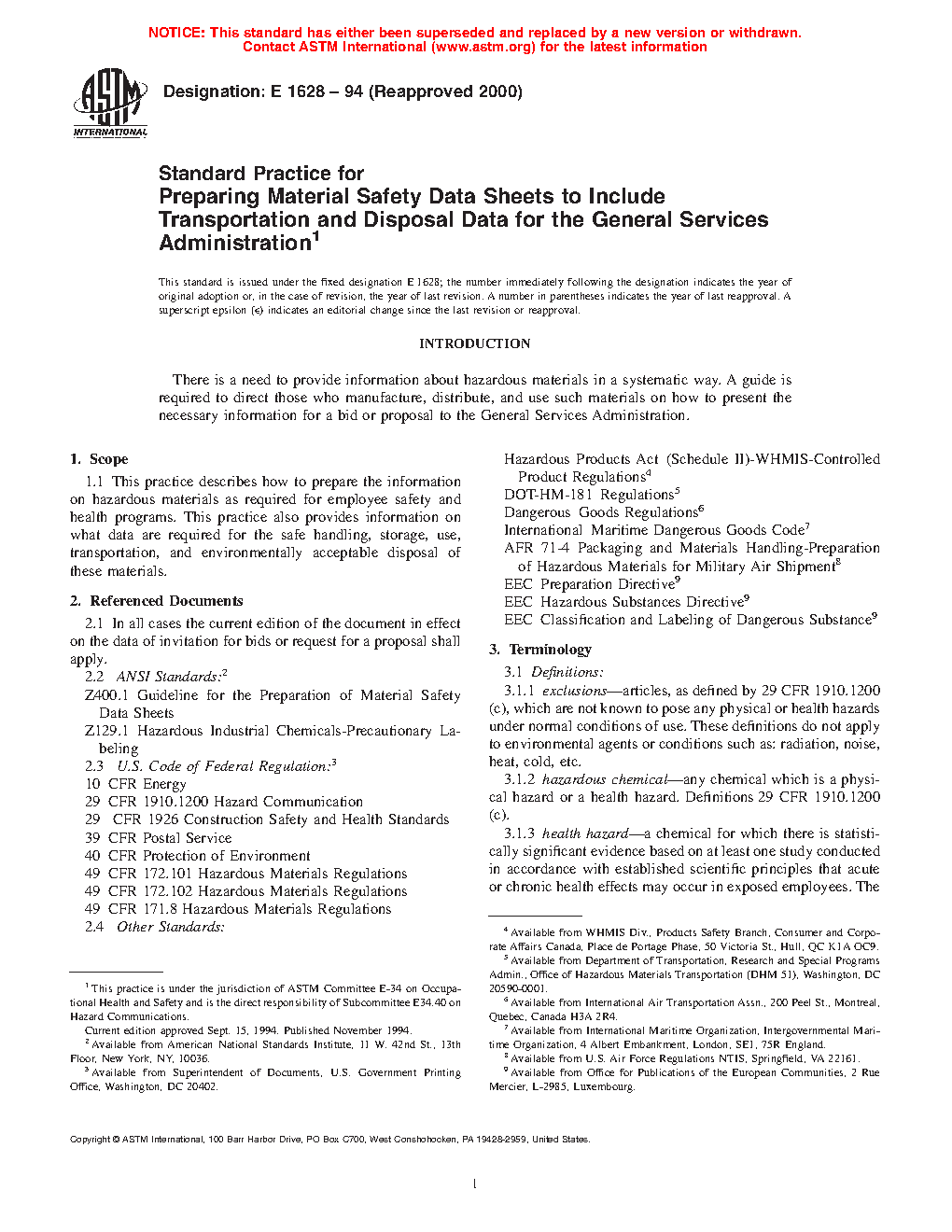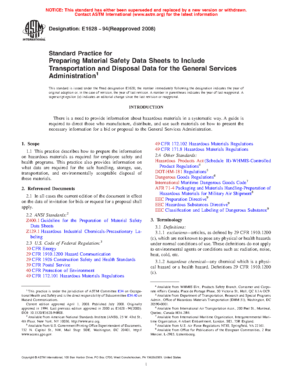 1.1 This practice describes how to prepare the information on hazardous materials as required for employee safety and health programs. This practice also provides information on what data are required for the safe handling, storage, use, transportation, and environmentally acceptable disposal of these materials.