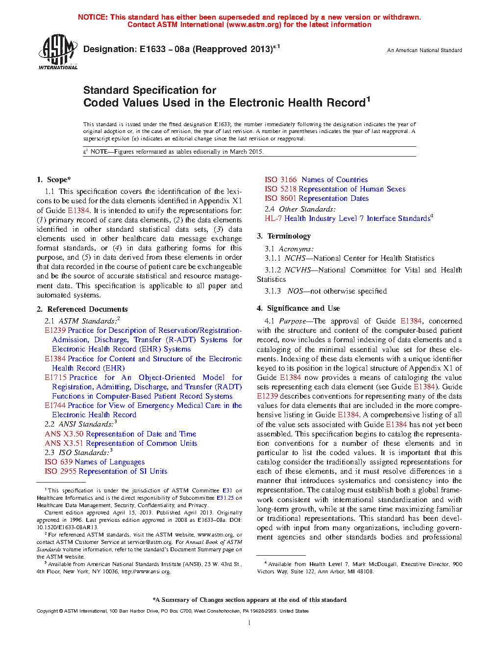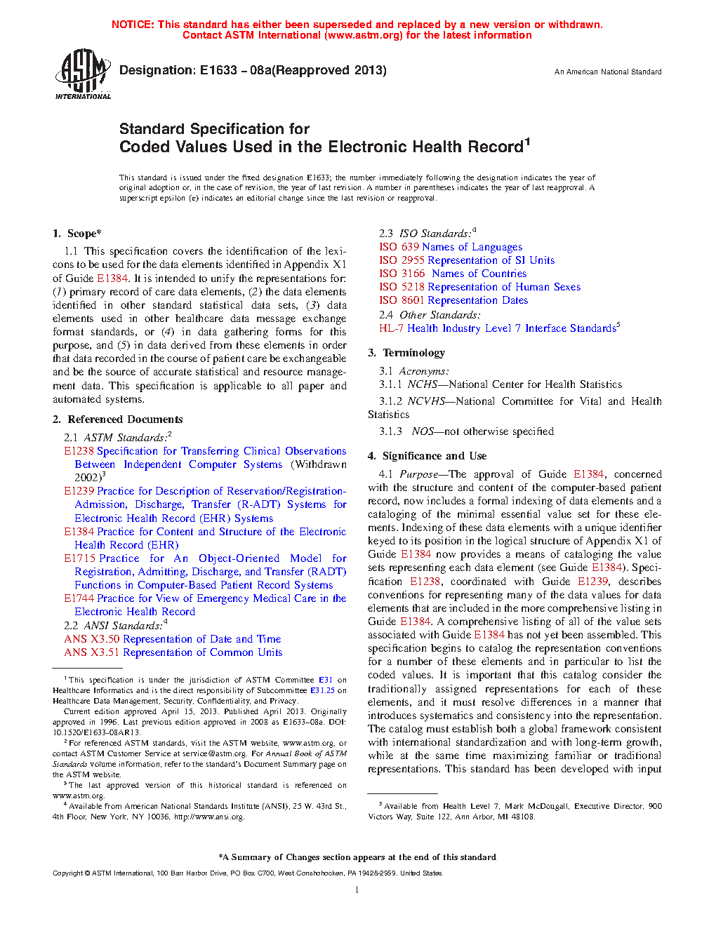 This specification covers all paper and automated systems related to the identification of the lexicons to be used for the data elements intended to unify the representations for: (1) primary record of care data elements; (2) the data elements identified in other standard statistical data sets; (3) data elements used in other healthcare data message exchange format standards, or (4) in data gathering forms for this purpose; and (5) in data derived from these elements in order that data recorded in the course of patient care be exchangeable and be the source of accurate statistical and resource management data.