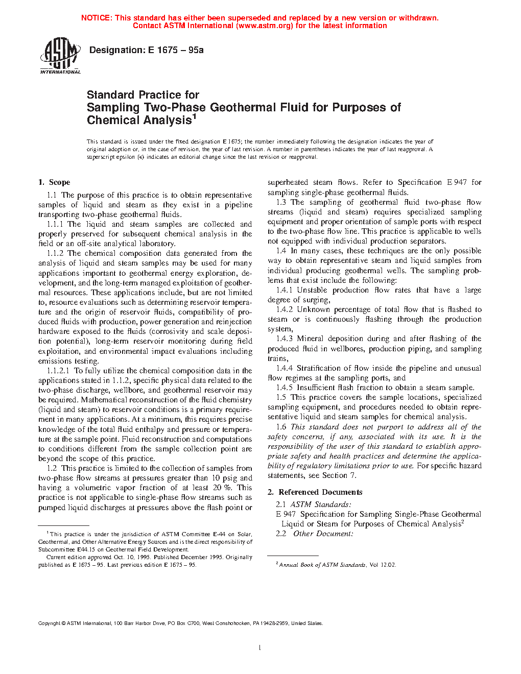 1.2 This practice is limited to the collection of samples from two-phase flow streams at pressures greater than 70 kPa gauge (10 psig) and having a volumetric vapor fraction of at least 20 %. This practice is not applicable to single-phase flow streams such as pumped liquid discharges at pressures above the flash point or superheated steam flows. Refer to Specification E 947 for sampling single-phase geothermal fluids.