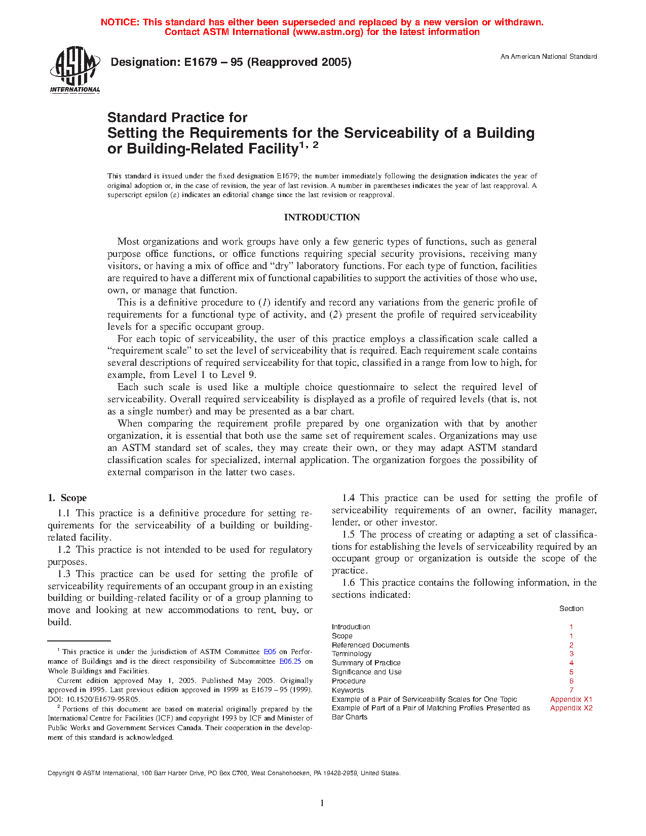 Section Introduction 1 Scope 1 Referenced Documents 2 Terminology 3 Summary of Practice 4 Significance and Use 5 Procedure 6 Keywords 7 Example of a Pair of Serviceability Scales for One Topic X1 Example of Part of a Pair of Matching Profiles Presented as Bar Charts X2 Example of Titles of Serviceability Aspects, Topics, and Features X3 Example of a List of Common Generic Types of Function X4