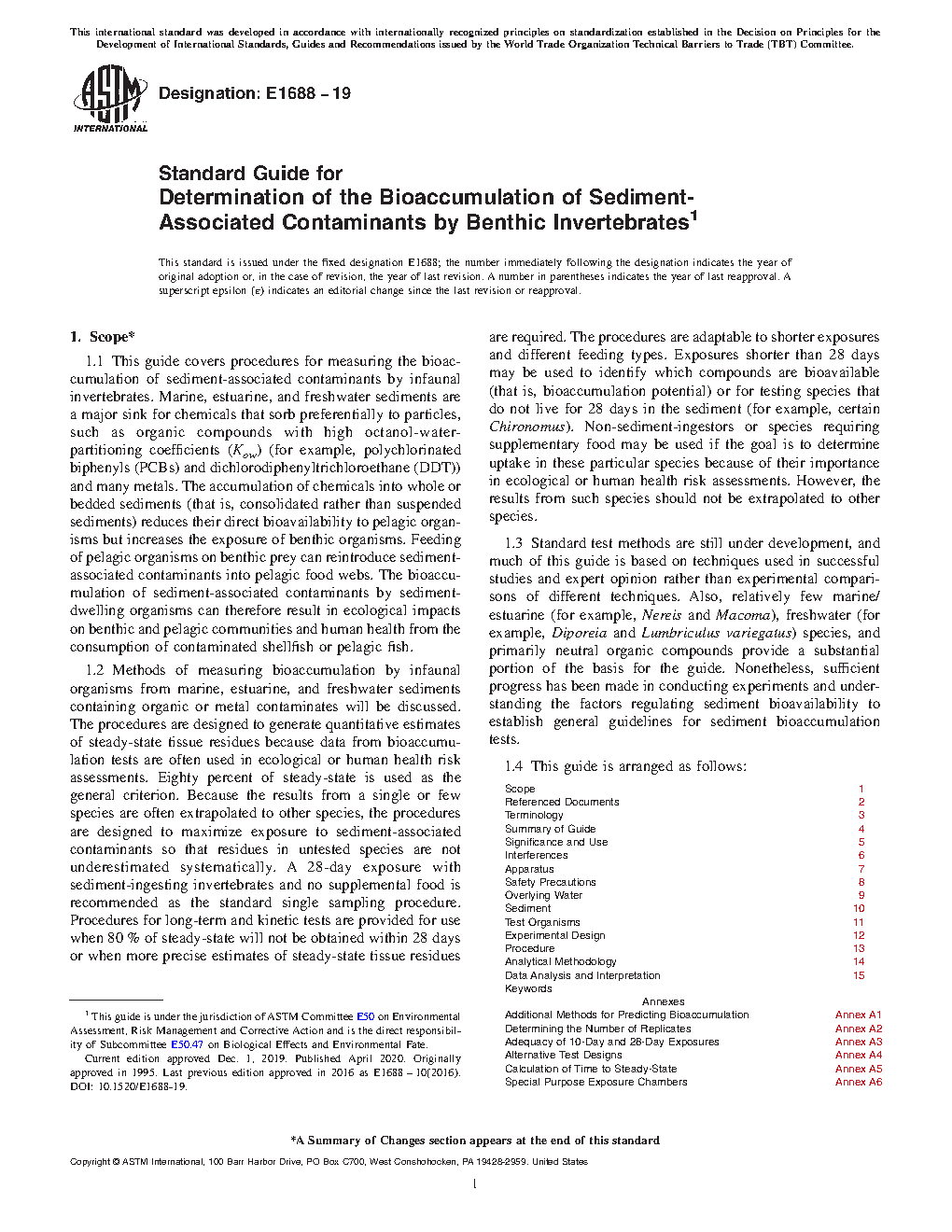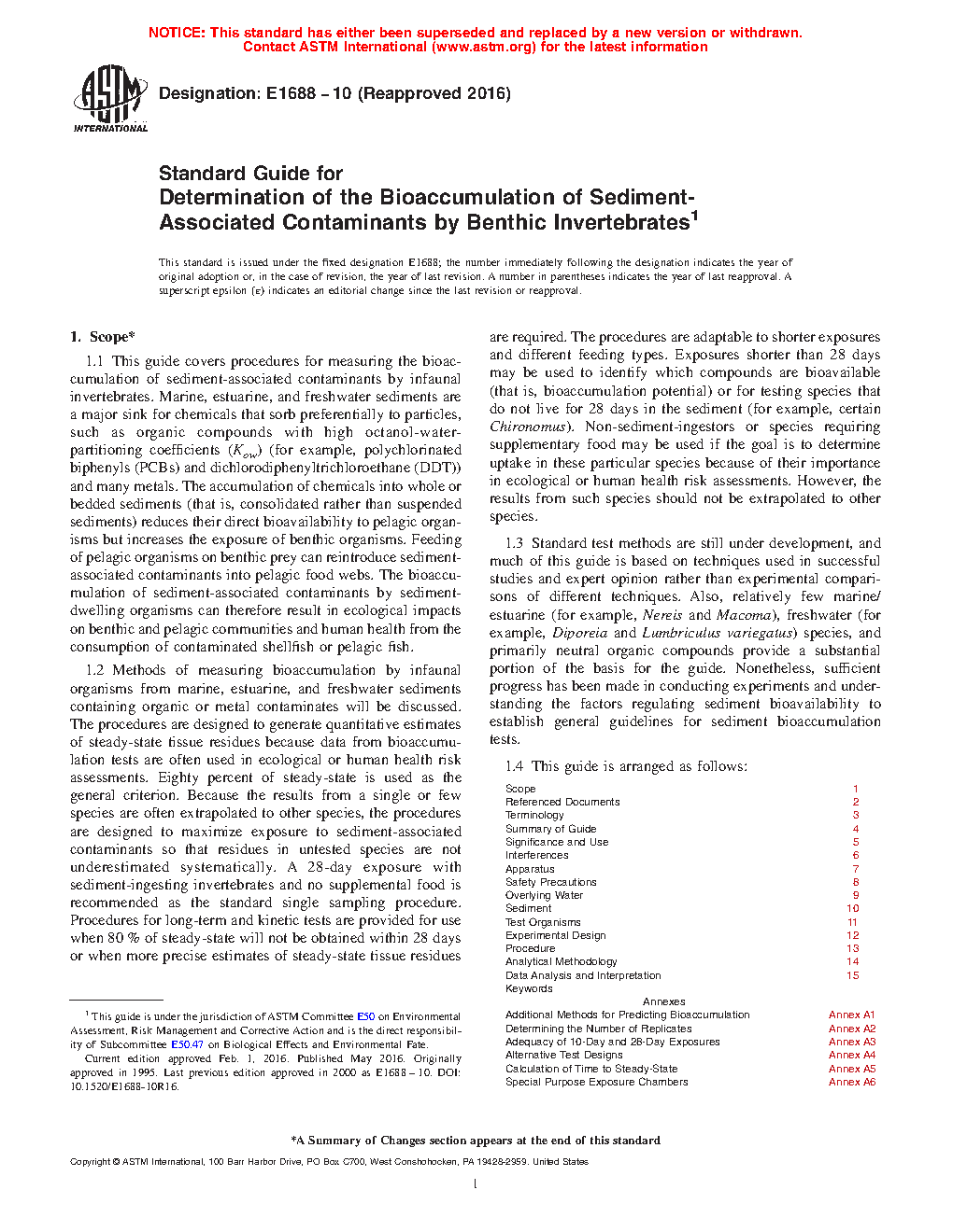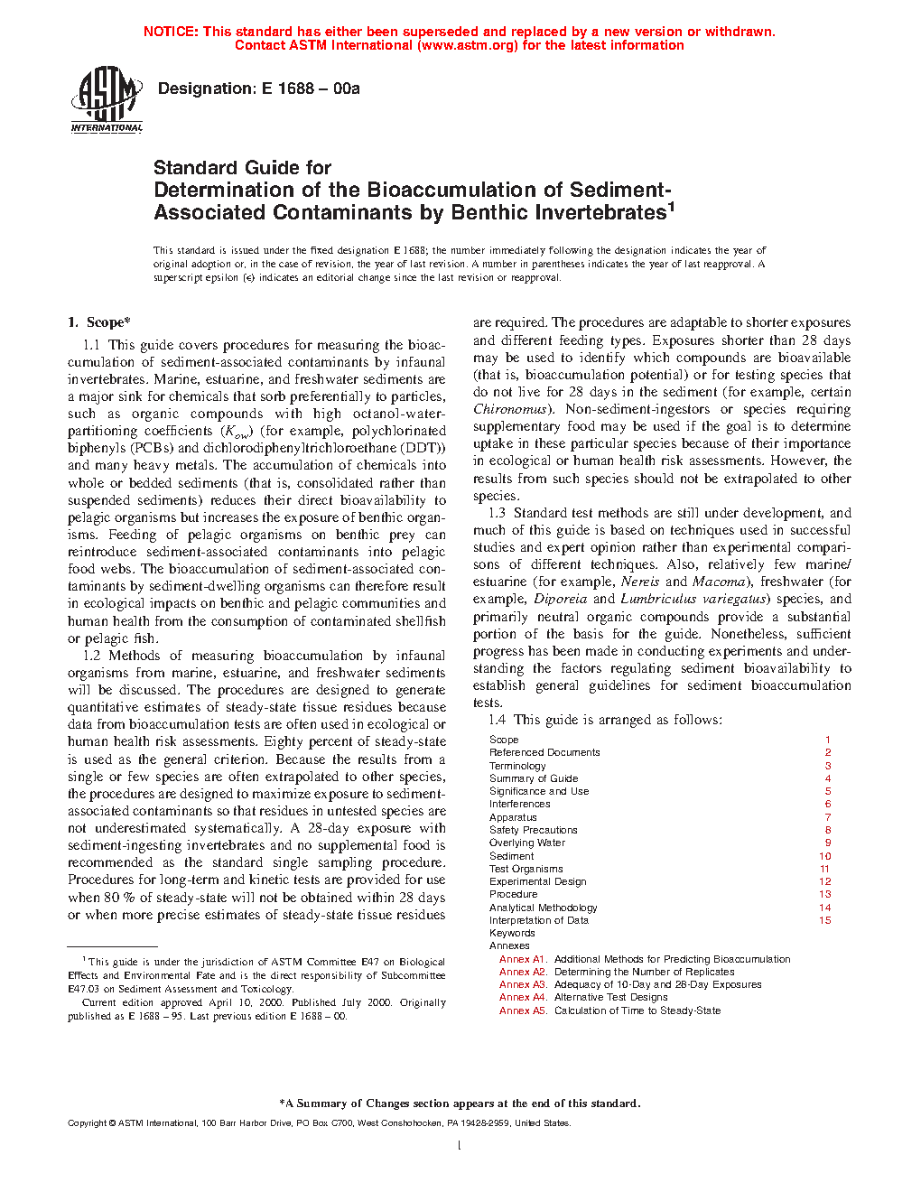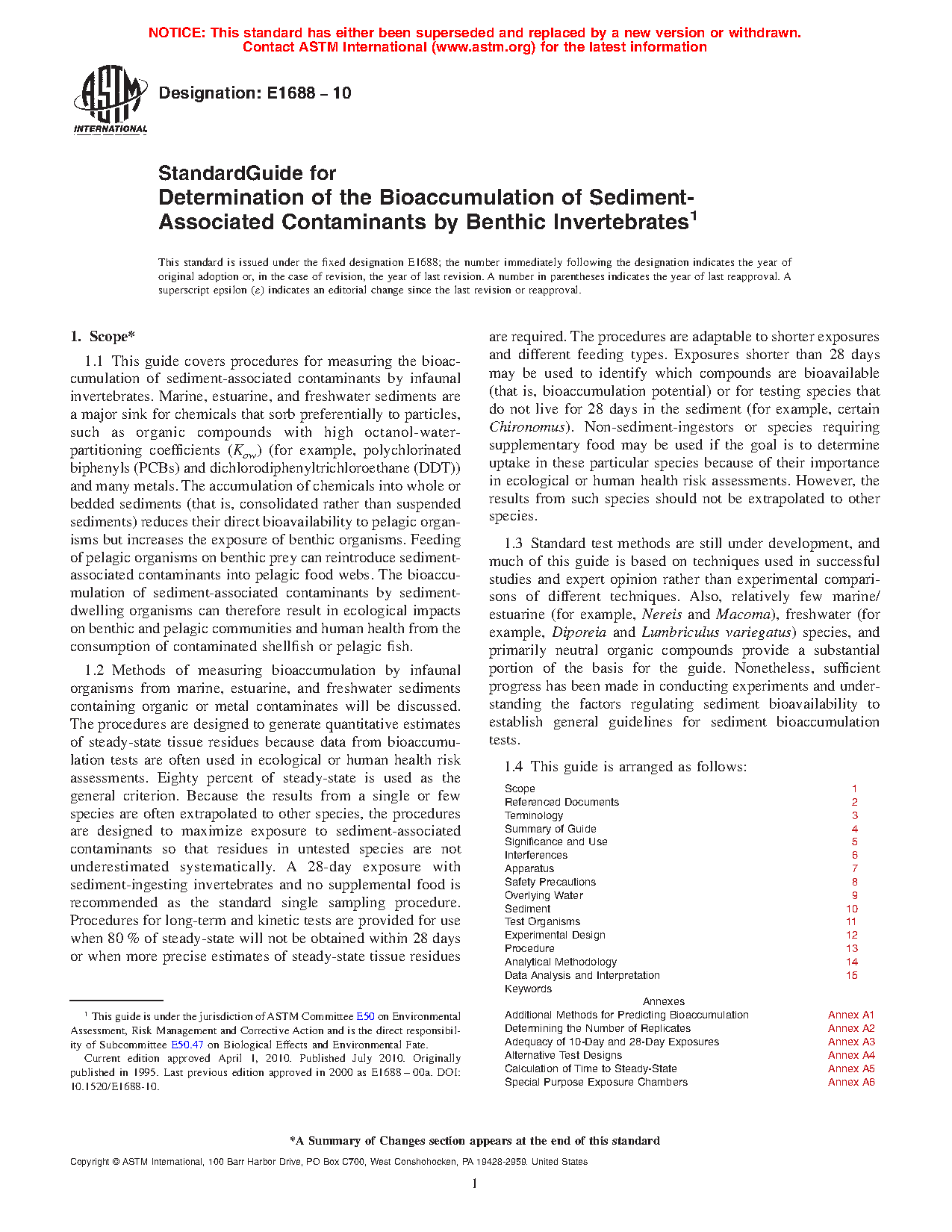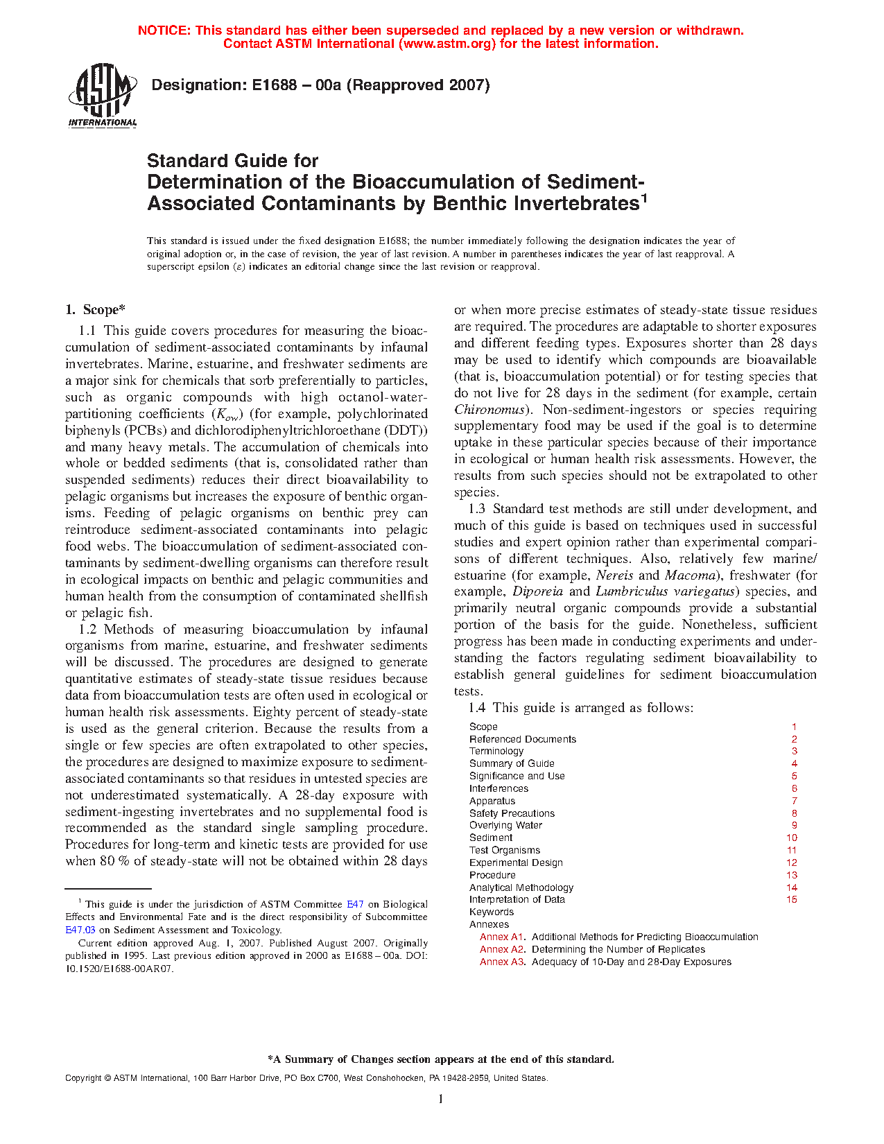 1.1 This guide covers procedures for measuring the bioaccumulation of sediment-associated contaminants by infaunal invertebrates. Marine, estuarine, and freshwater sediments are a major sink for chemicals that sorb preferentially to particles, such as organic compounds with high octanol-water-partitioning coefficients (Kow) (for example, polychlorinated biphenyls (PCBs) and dichlorodiphenyltrichloroethane (DDT)) and many metals. The accumulation of chemicals into whole or bedded sediments (that is, consolidated rather than suspended sediments) reduces their direct bioavailability to pelagic organisms but increases the exposure of benthic organisms. Feeding of pelagic organisms on benthic prey can reintroduce sediment-associated contaminants into pelagic food webs. The bioaccumulation of sediment-associated contaminants by sediment-dwelling organisms can therefore result in ecological impacts on benthic and pelagic communities and human health from the consumption of contaminated shellfish or pelagic fish.