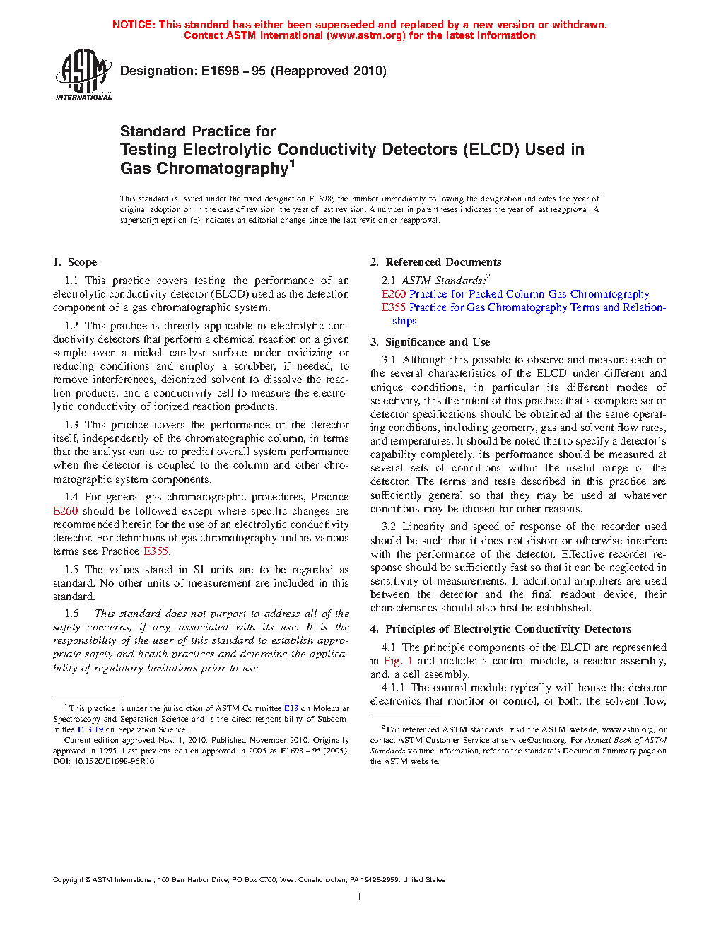 1.4 For general gas chromatographic procedures, Practice E260 should be followed except where specific changes are recommended herein for the use of an electrolytic conductivity detector. For definitions of gas chromatography and its various terms see Practice E355.
