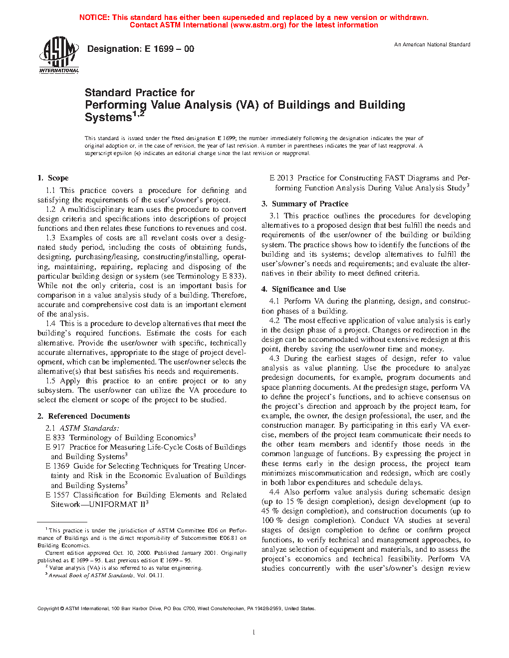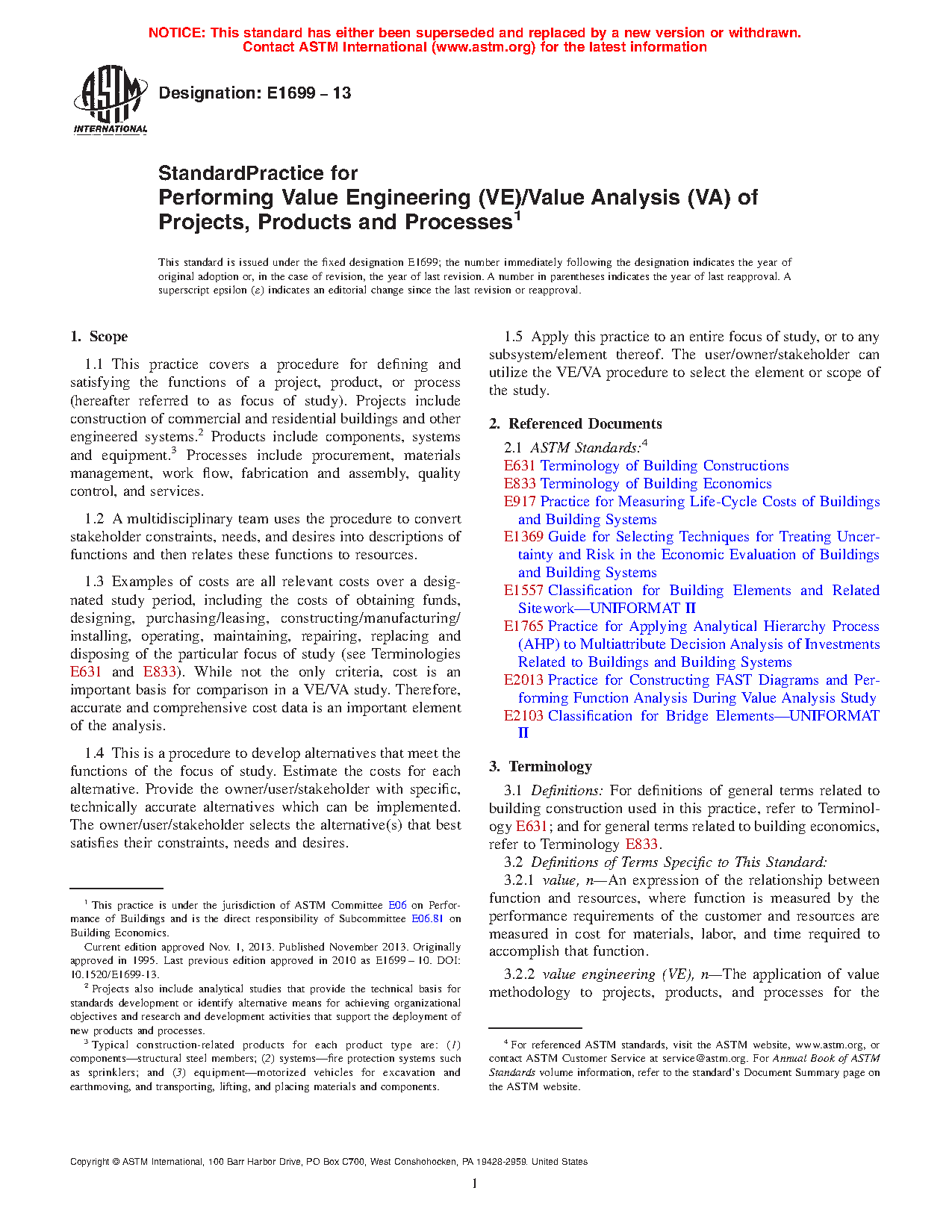 1.1Â This practice covers a procedure for defining and satisfying the functions of a project, product, or process (hereafter referred to as focus of study). Projects include construction of commercial and residential buildings and other engineered systems. Products include components, systems and equipment. Processes include procurement, materials management, work flow, fabrication and assembly, quality control, and services.