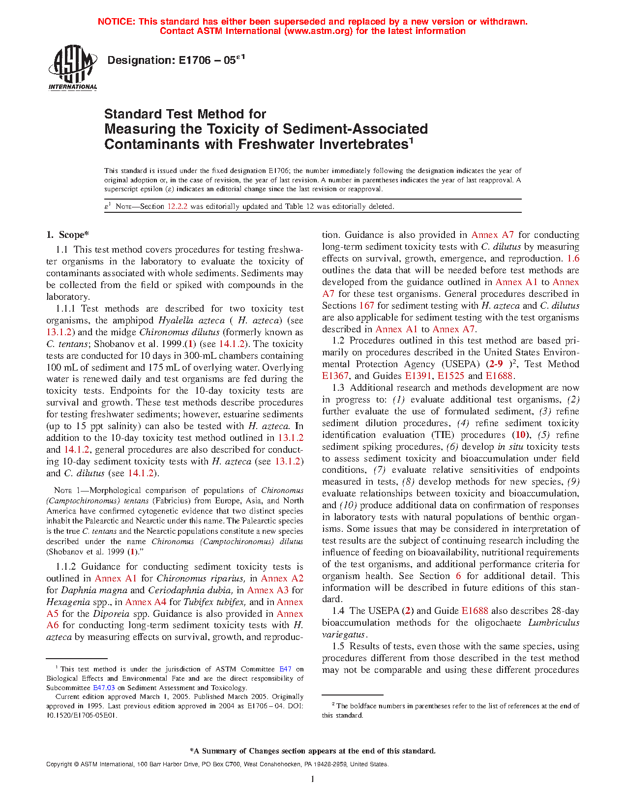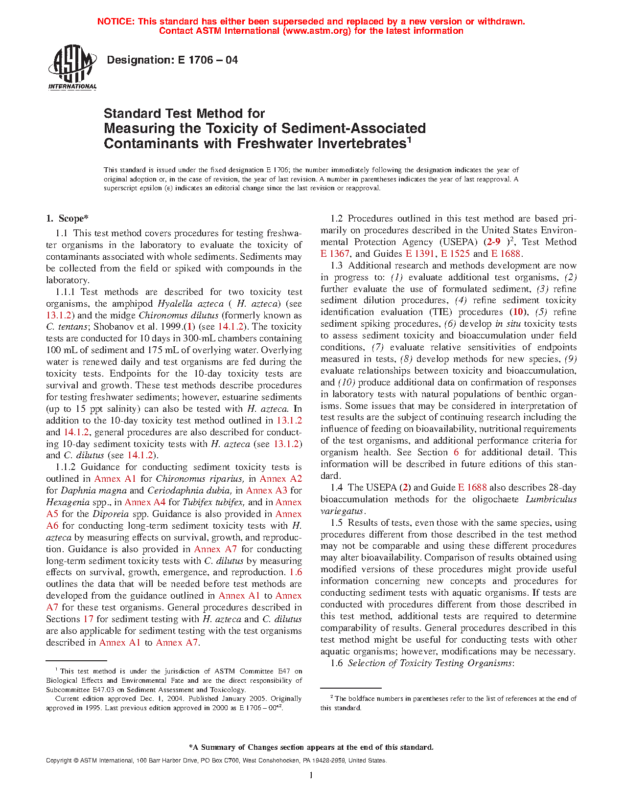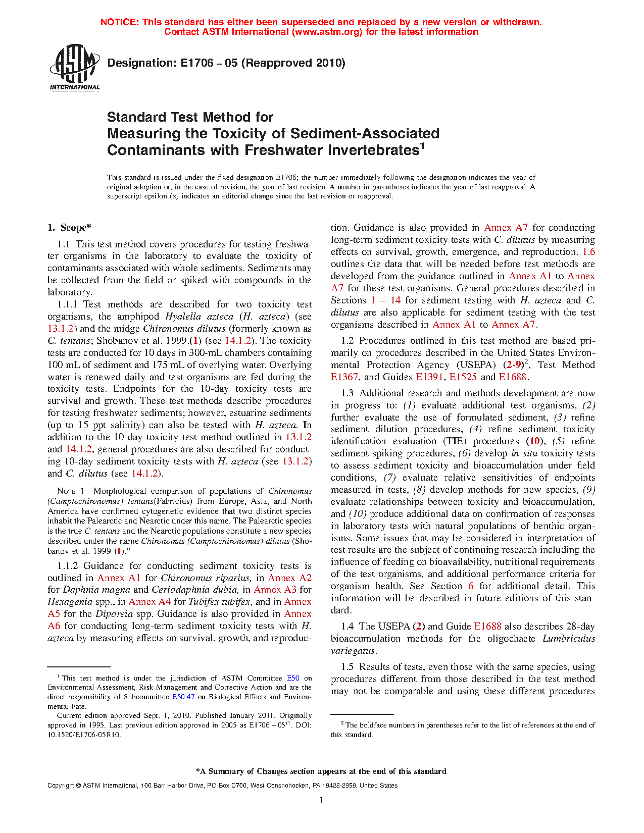 1.6.2 Of the criteria outlined in Table 1, a data base demonstrating relative sensitivity to contaminants, contact with sediment, ease of culture in the laboratory, interlaboratory comparisons, tolerance of varying sediment physico-chemical characteristics, and confirmation with responses of natural benthos populations were the primary criteria used for selecting H. azteca and C. tentans to be described as test methods in the current version of this standard (see Sections 13 and 14). Procedures for conducting sediment tests with organisms in accordance with Annex A1 to Annex A7 do not currently meet all the required selection criteria listed in Table 1. A similar data base must be developed before these or other test organisms can be included as standard test methods instead of as guidance in future versions of these this method.