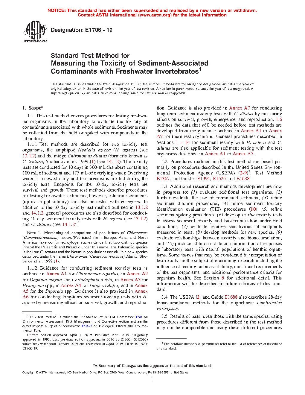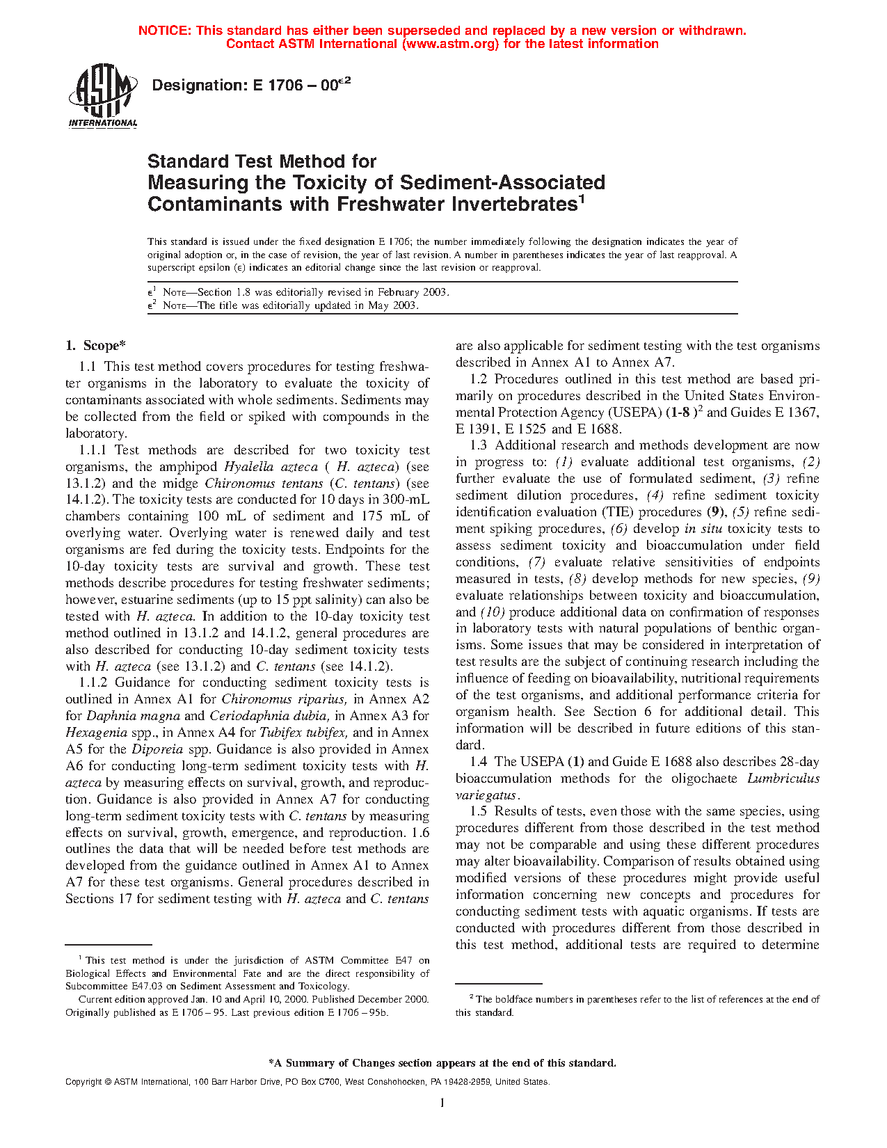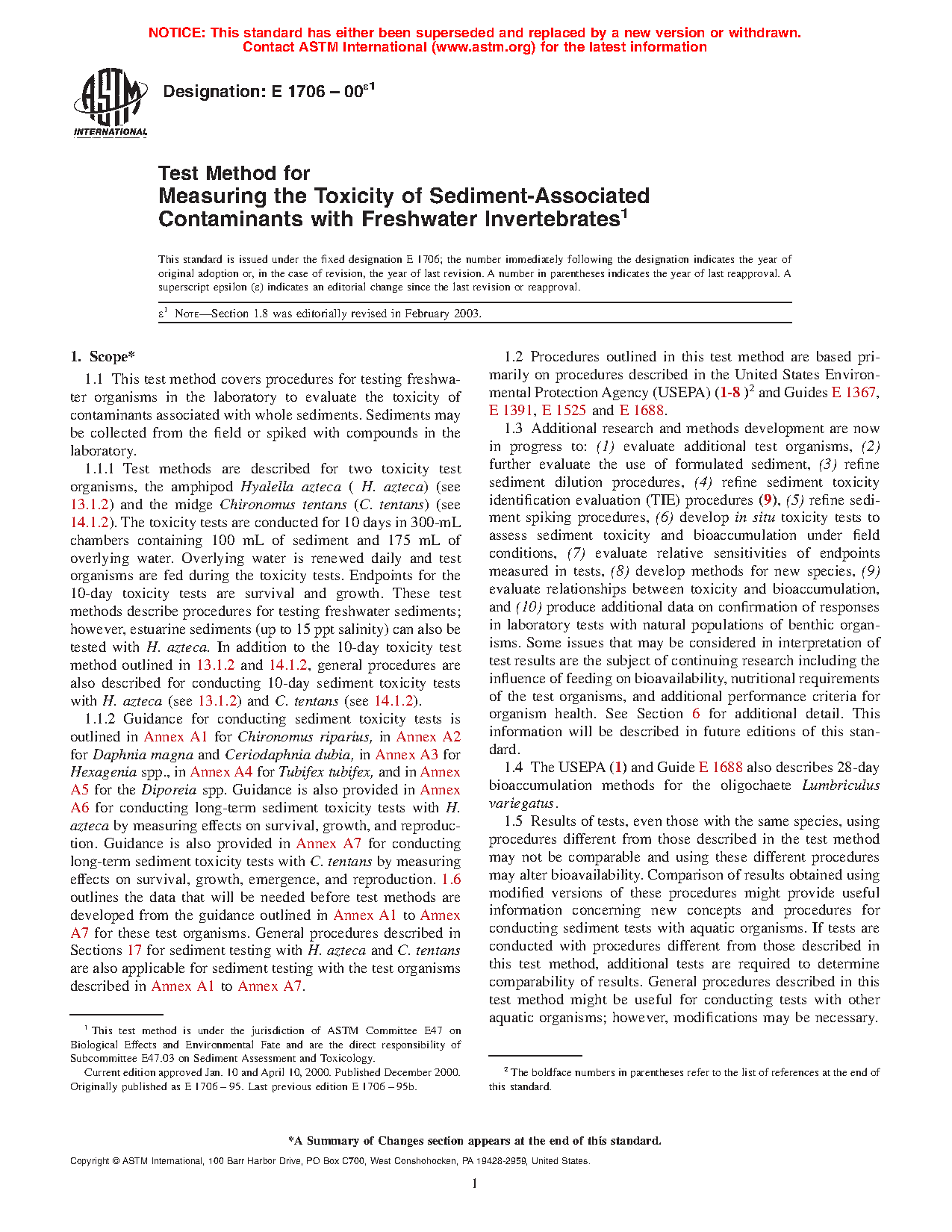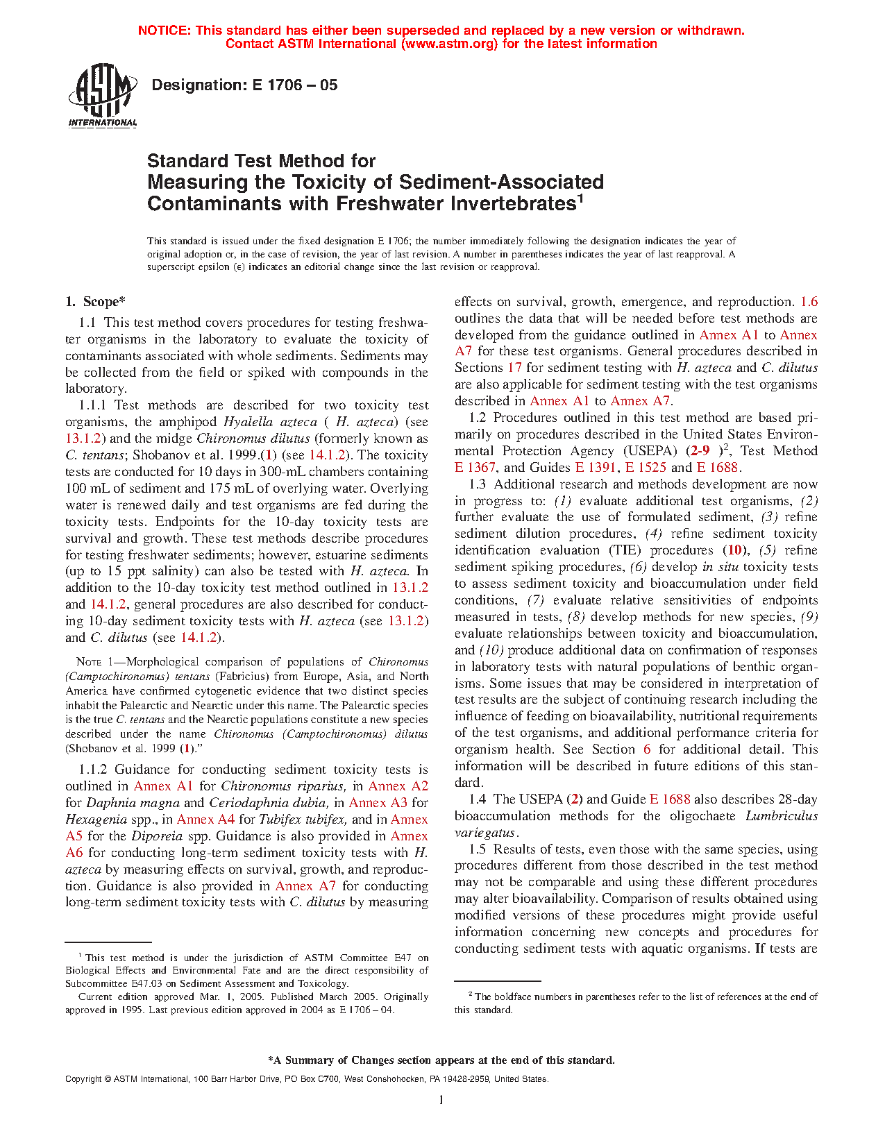 1.6.2 Of the criteria outlined in Table 1, a data base demonstrating relative sensitivity to contaminants, contact with sediment, ease of culture in the laboratory, interlaboratory comparisons, tolerance of varying sediment physico-chemical characteristics, and confirmation with responses of natural benthos populations were the primary criteria used for selecting H. azteca and C. tentans to be described as test methods in the current version of this standard (see Sections 13 and 14). Procedures for conducting sediment tests with organisms in accordance with Annex A1 to Annex A7 do not currently meet all the required selection criteria listed in Table 1. A similar data base must be developed before these or other test organisms can be included as standard test methods instead of as guidance in future versions of these this method.