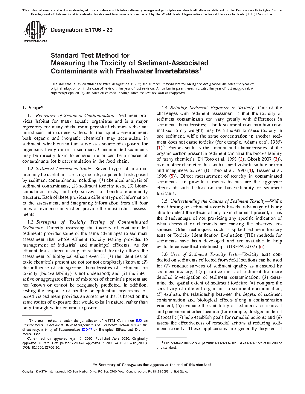 1.7 Limitations— While some safety considerations are included in this standard, it is beyond the scope of this standard to encompass all safety requirements necessary to conduct sediment tests.