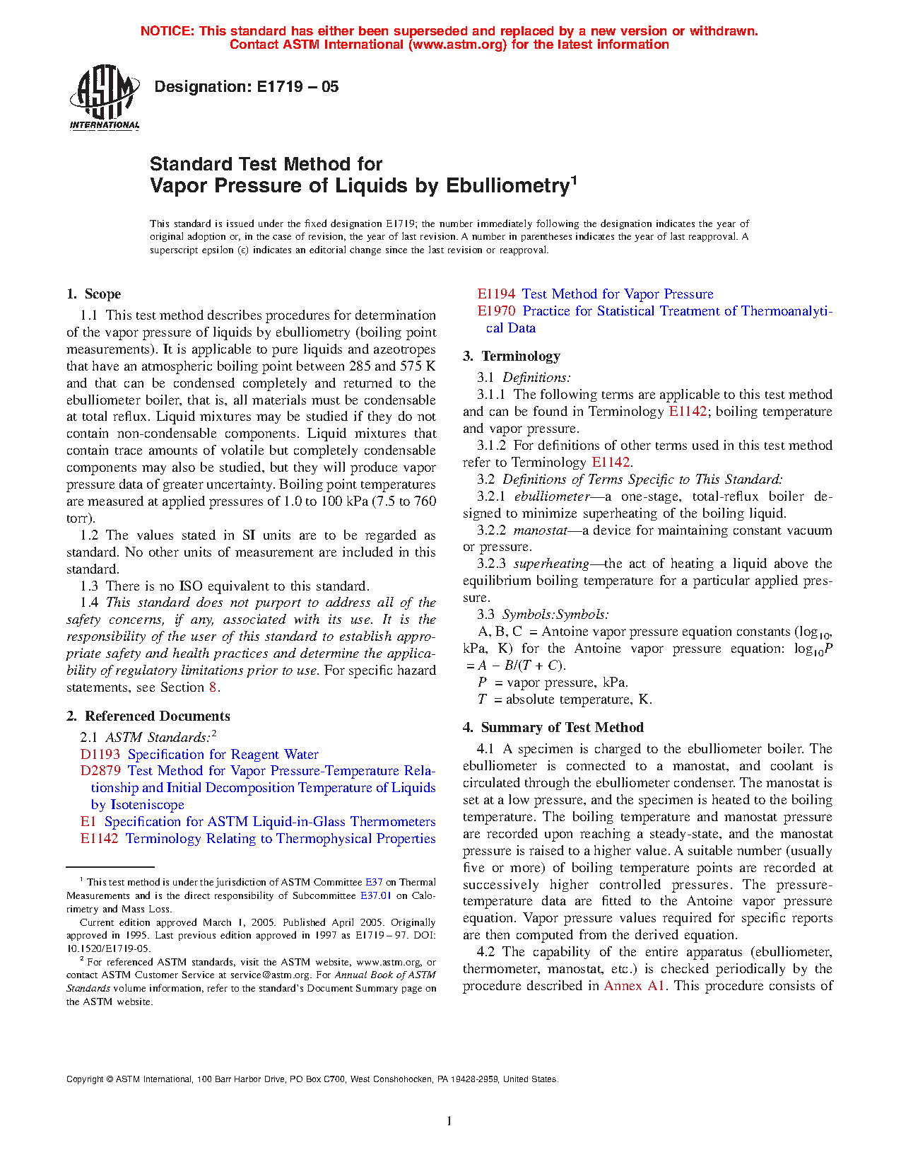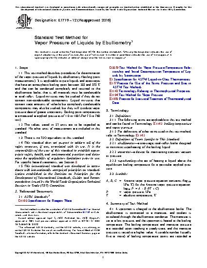 1.1 This test method describes procedures for determination of the vapor pressure of liquids by ebulliometry (boiling point measurements). It is applicable to pure liquids and azeotropes that have an atmospheric boiling point between 285 and 575 K and that can be condensed completely and returned to the ebulliometer boiler, that is, all materials must be condensable at total reflux. Liquid mixtures may be studied if they do not contain non-condensable components. Liquid mixtures that contain trace amounts of volatile but completely condensable components may also be studied, but they will produce vapor pressure data of greater uncertainty. Boiling point temperatures are measured at applied pressures of 1.0 to 100 kPa (7.5 to 760 torr).