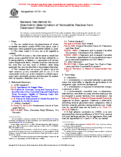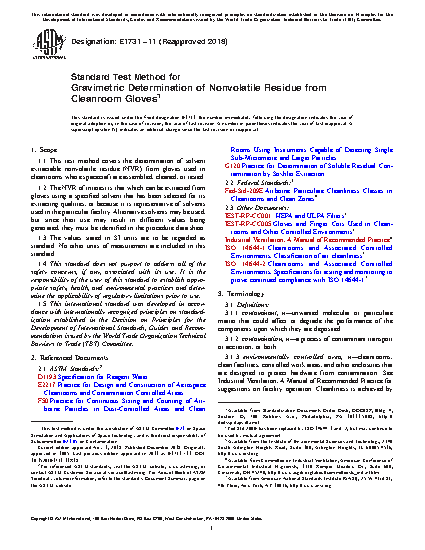 1.1 This test method covers the determination of solvent extractable nonvolatile residue (NVR) from gloves used in cleanrooms where spacecraft are assembled, cleaned, or tested.