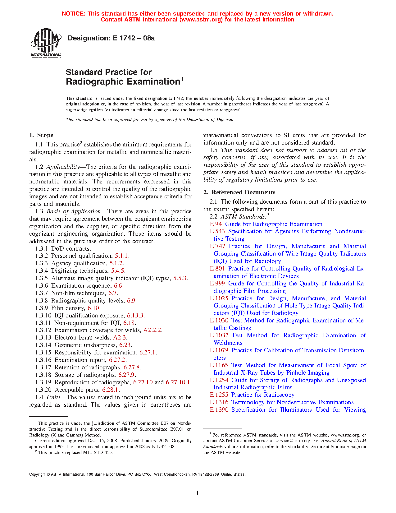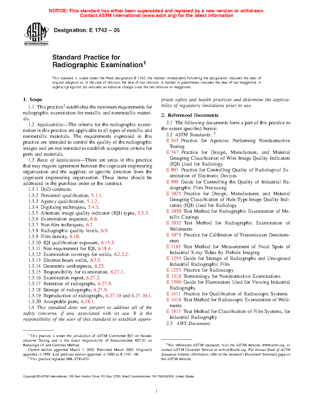 1.2 ApplicabilityThe criteria for the radiographic examination in this practice are applicable to all types of metallic and nonmetallic materials. The requirements expressed in this practice are intended to control the quality of the radiographic images and are not intended to establish acceptance criteria for parts and materials.
