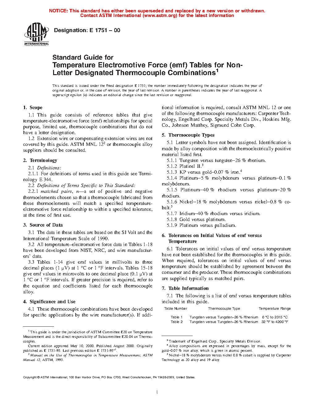 Standard Guide for Temperature Electromotive Force (emf) Tables for Non-Letter Designated Thermocouple Combinations (Withdrawn 2009)