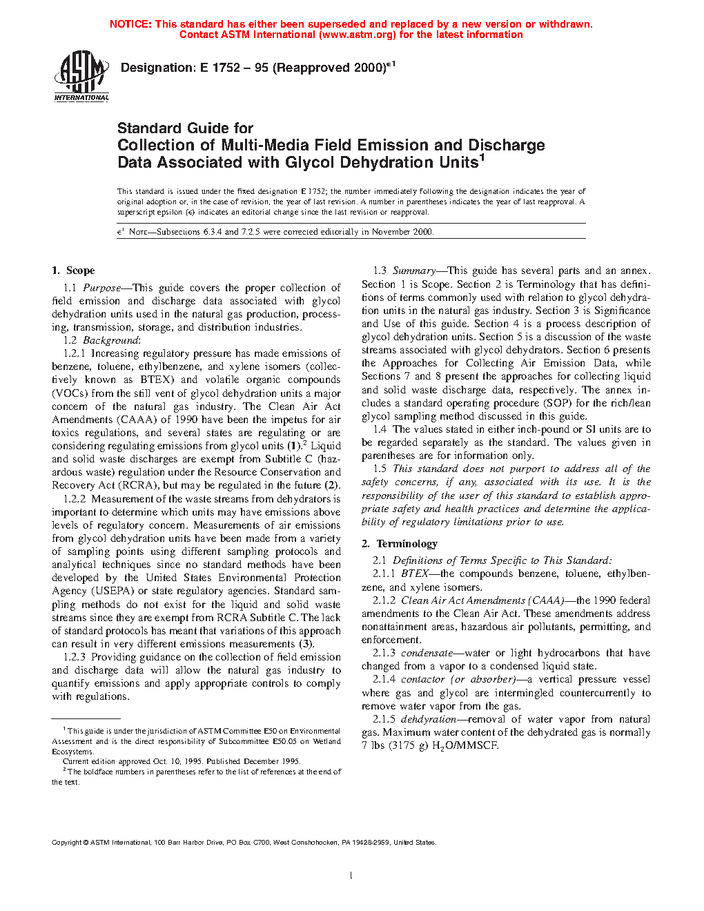 1.3 Summary--This guide has several parts and an annex. Section 1 is Scope. Section 2 is Terminology that has definitions of terms commonly used with relation to glycol dehydration units in the natural gas industry. Section 3 is Significance and Use of this guide. Section 4 is a process description of glycol dehydration units. Section 5 is a discussion of the waste streams associated with glycol dehydrators. Section 6 presents the Approaches for Collecting Air Emission Data, while Sections 7 and 8 present the approaches for collecting liquid and solid waste discharge data, respectively. The annex includes a standard operating procedure (SOP) for the rich/lean glycol sampling method discussed in this guide.