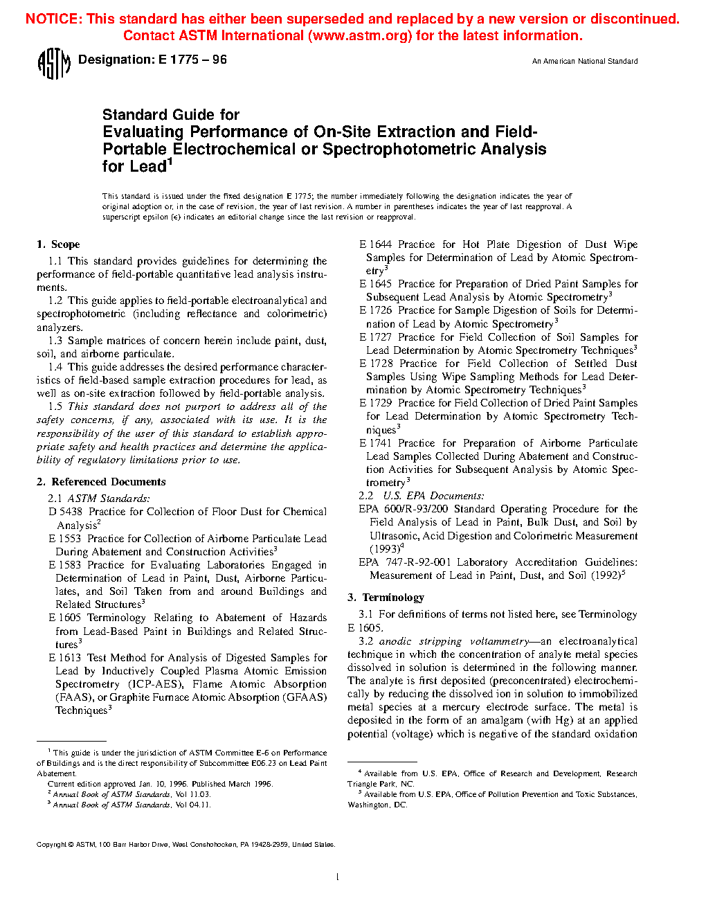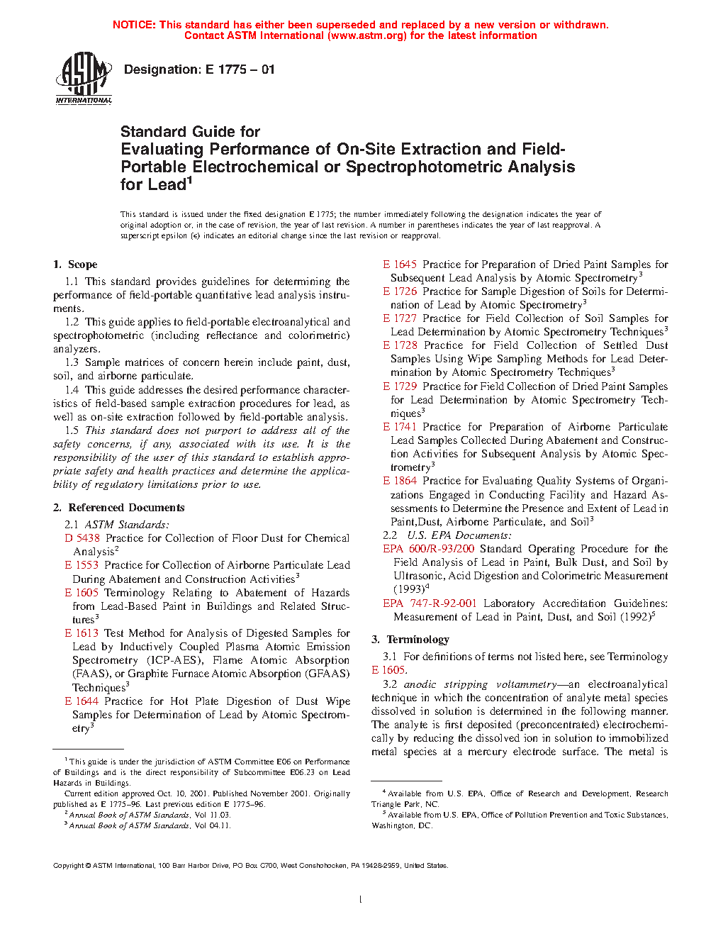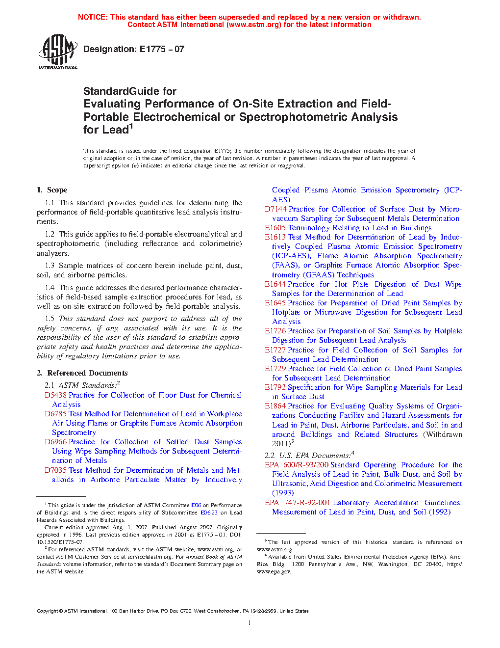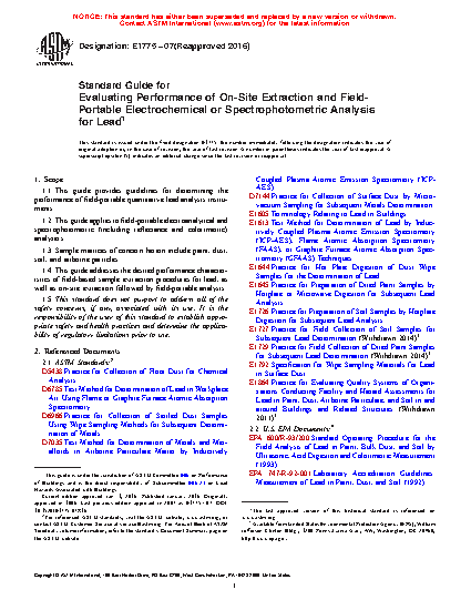 1.4 This guide addresses the desired performance characteristics of field-based sample extraction procedures for lead, as well as on-site extraction followed by field-portable analysis.