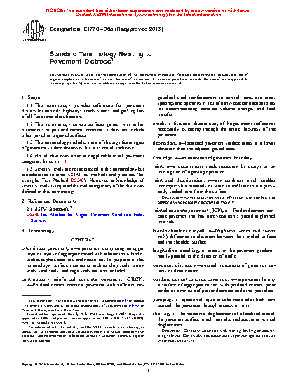 1.1 This terminology provides definitions for pavement distress for airfields, highways, roads, streets, and parking lots of all functional classifications.