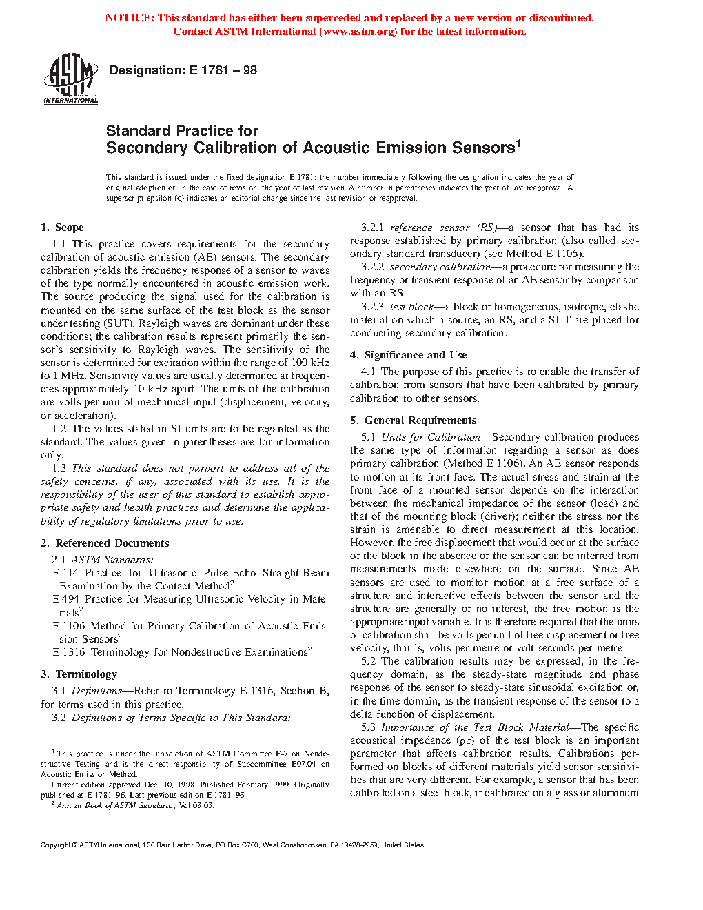 1.1 This practice covers requirements for the secondary calibration of acoustic emission (AE) sensors. The secondary calibration yields the frequency response of a sensor to waves of the type normally encountered in acoustic emission work. The source producing the signal used for the calibration is mounted on the same surface of the test block as the sensor under testing (SUT). Rayleigh waves are dominant under these conditions; the calibration results represent primarily the sensor's sensitivity to Rayleigh waves. The sensitivity of the sensor is determined for excitation within the range of 100 kHz to 1 MHz. Sensitivity values are usually determined at frequencies approximately 10 kHz apart. The units of the calibration are volts per unit of mechanical input (displacement, velocity, or acceleration).