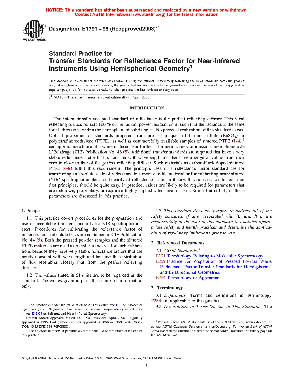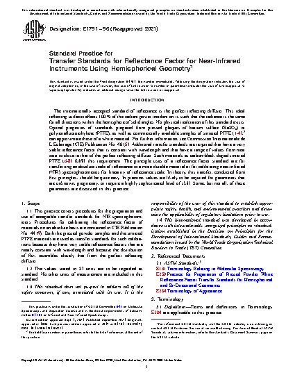 1.1 This practice covers procedures for the preparation and use of acceptable transfer standards for NIR spectrophotometers. Procedures for calibrating the reflectance factor of materials on an absolute basis are contained in CIE Publication No. 44 (9). Both the pressed powder samples and the sintered PTFE materials are used as transfer standards for such calibrations because they have very stable reflectance factors that are nearly constant with wavelength and because the distribution of flux resembles closely that from the perfect reflecting diffuser.