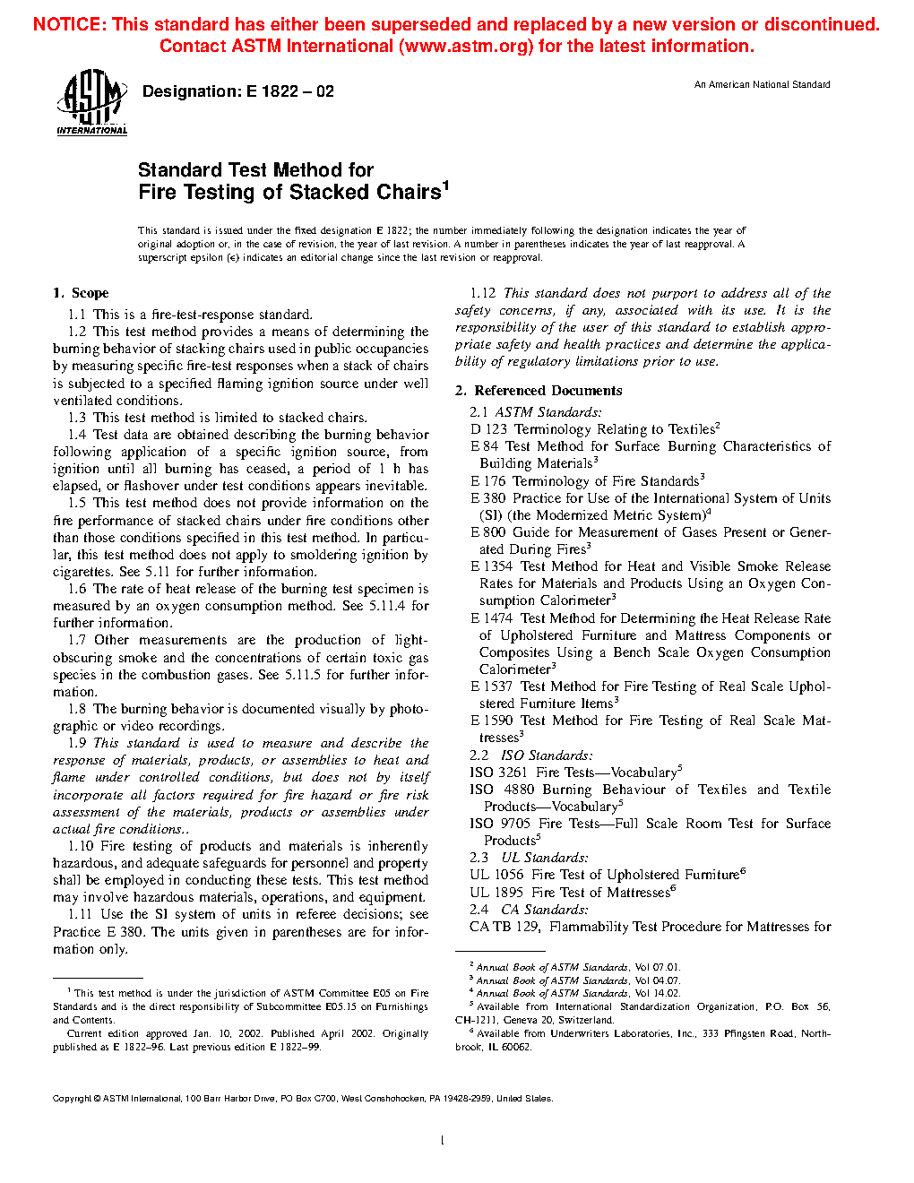 5.5 The type of ignition chosen (flaming source) is common in both accidental and intentional fires in public occupancies. This test method is thus applicable to stacked chairs in public occupancies. Such facilities include, but are not limited to, health-care facilities, old-age convalescent and board and care homes, college dormitories and residence halls, and hotels and motels.