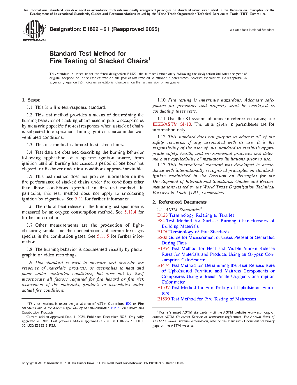 1.2 This test method provides a means of determining the burning behavior of stacking chairs used in public occupancies by measuring specific fire-test responses when a stack of chairs is subjected to a specified flaming ignition source under well ventilated conditions.