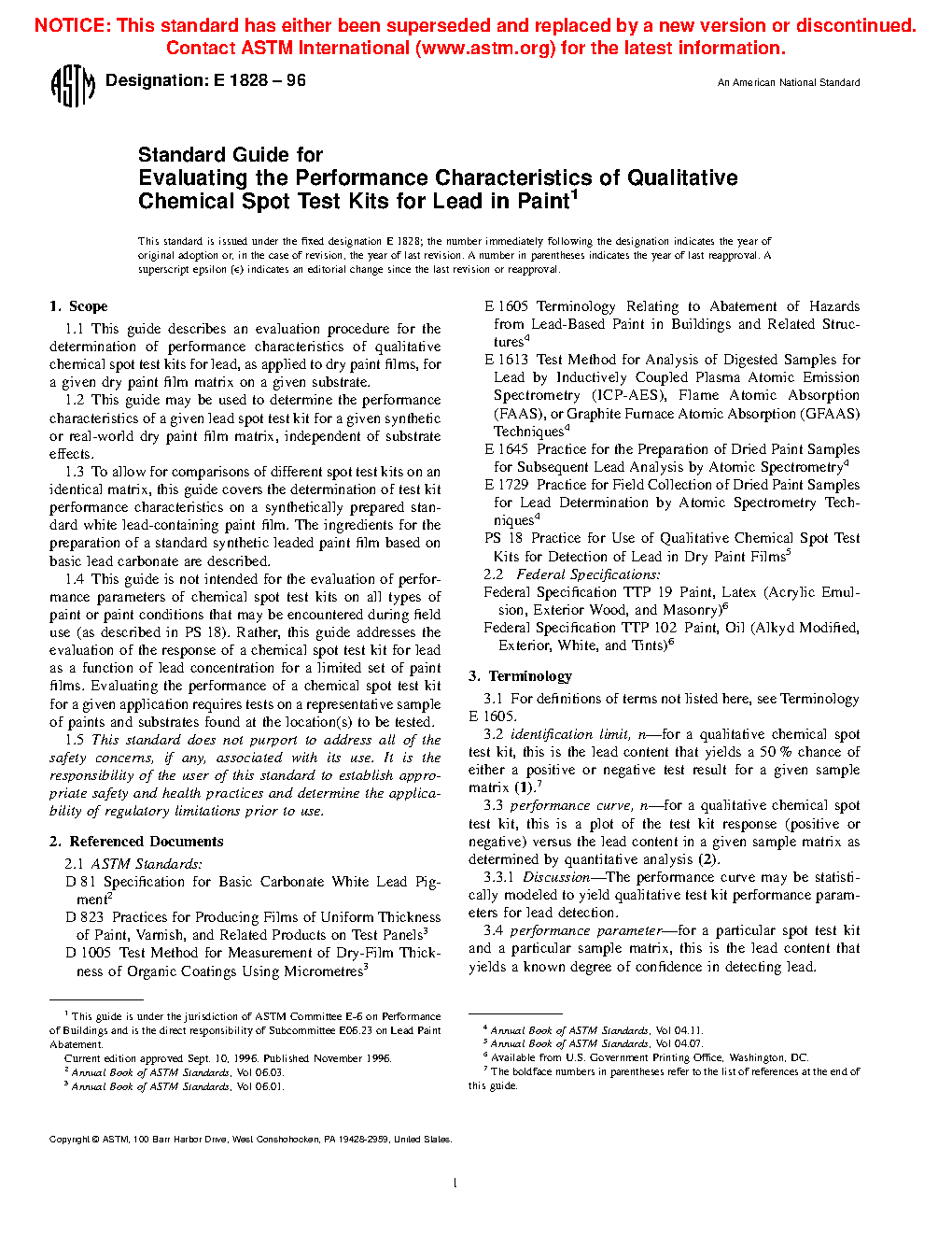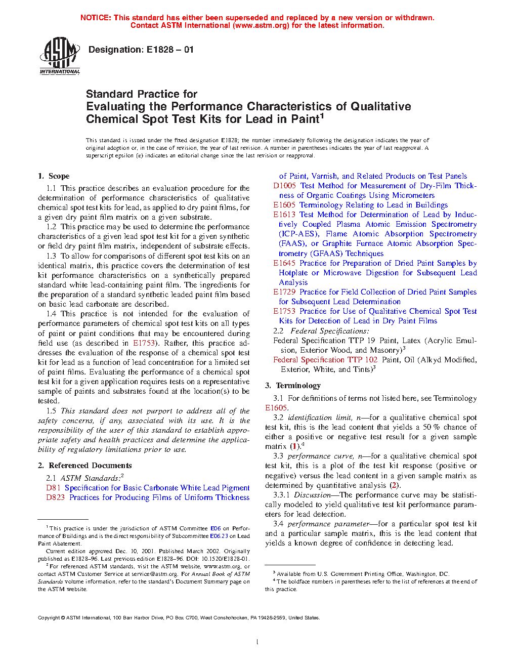 1.4 This practice is not intended for the evaluation of performance parameters of chemical spot test kits on all types of paint or paint conditions that may be encountered during field use (as described in E 1753). Rather, this practice addresses the evaluation of the response of a chemical spot test kit for lead as a function of lead concentration for a limited set of paint films. Evaluating the performance of a chemical spot test kit for a given application requires tests on a representative sample of paints and substrates found at the location(s) to be tested.