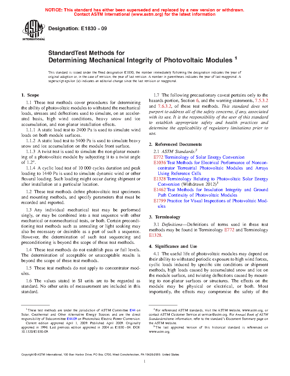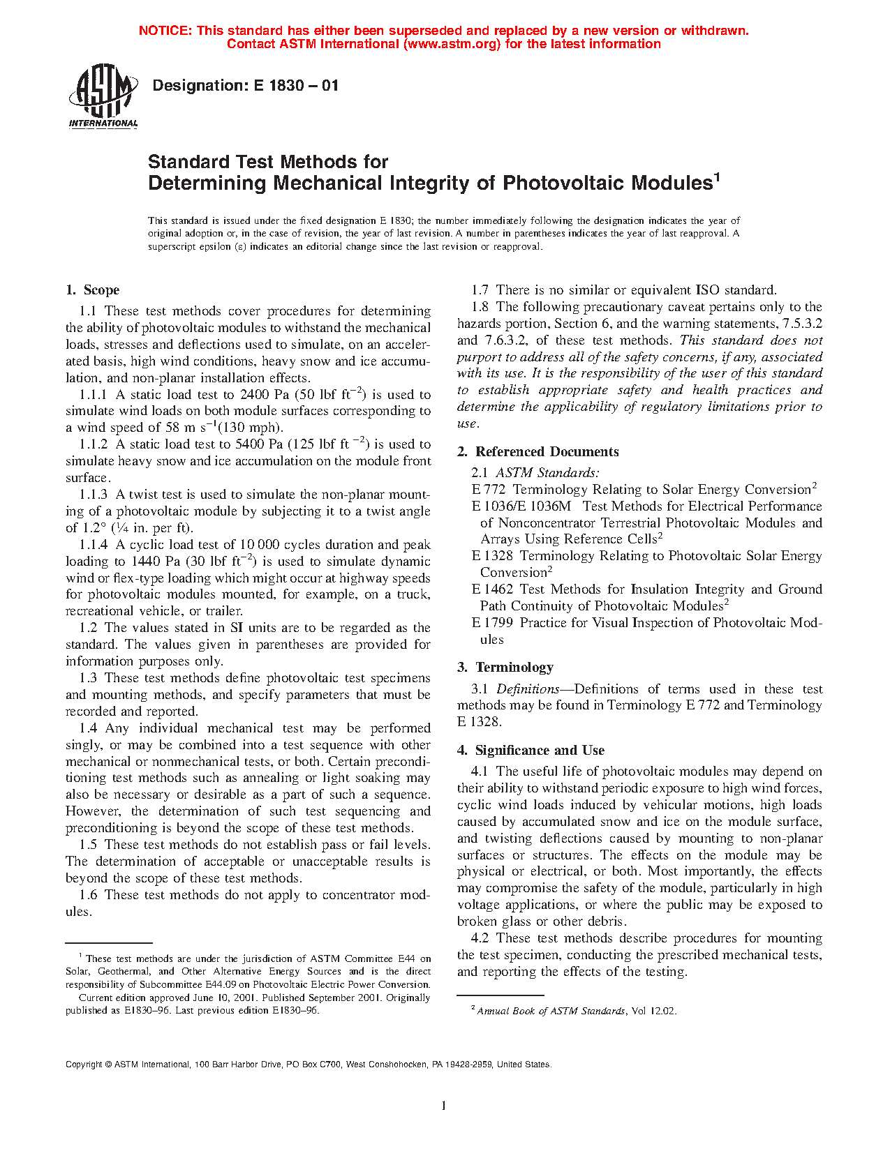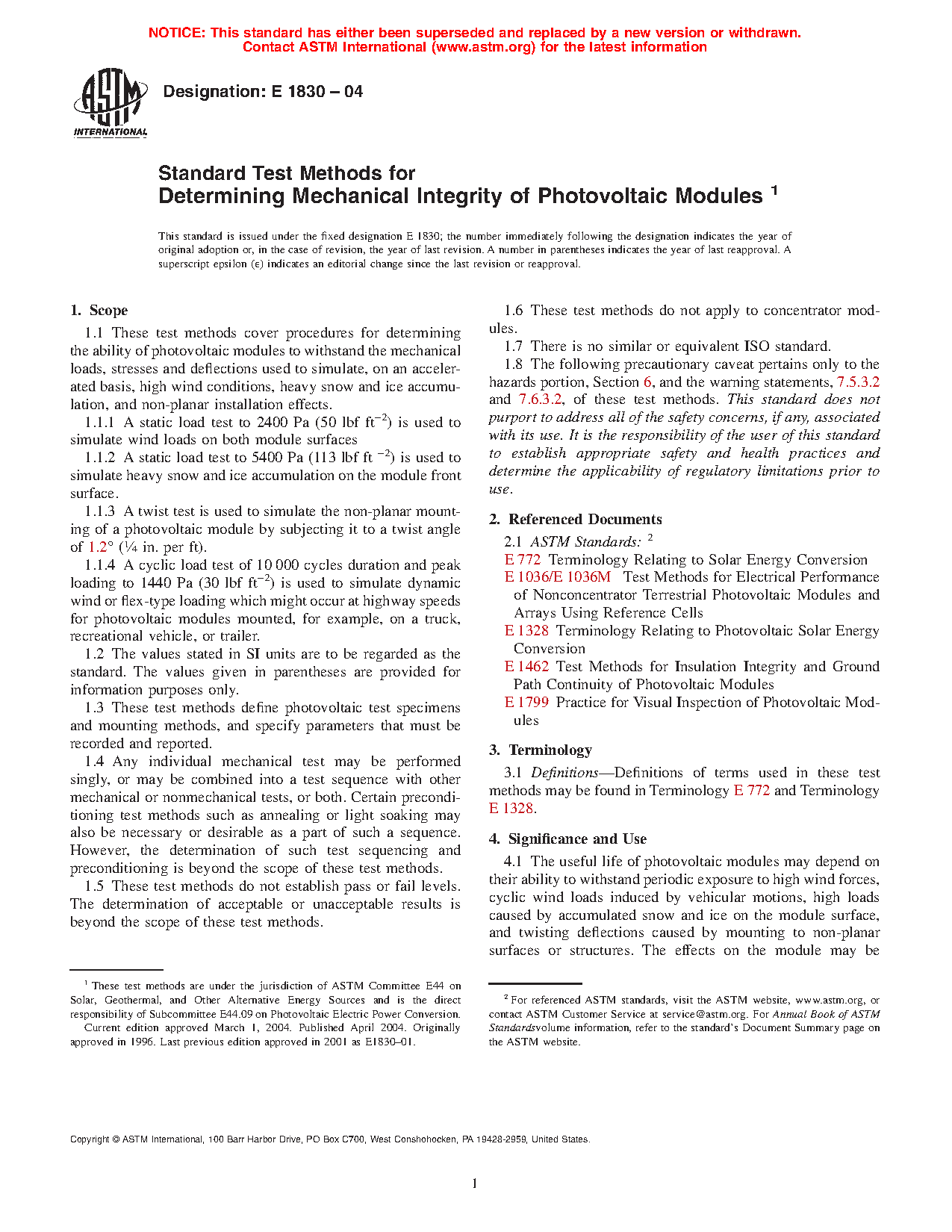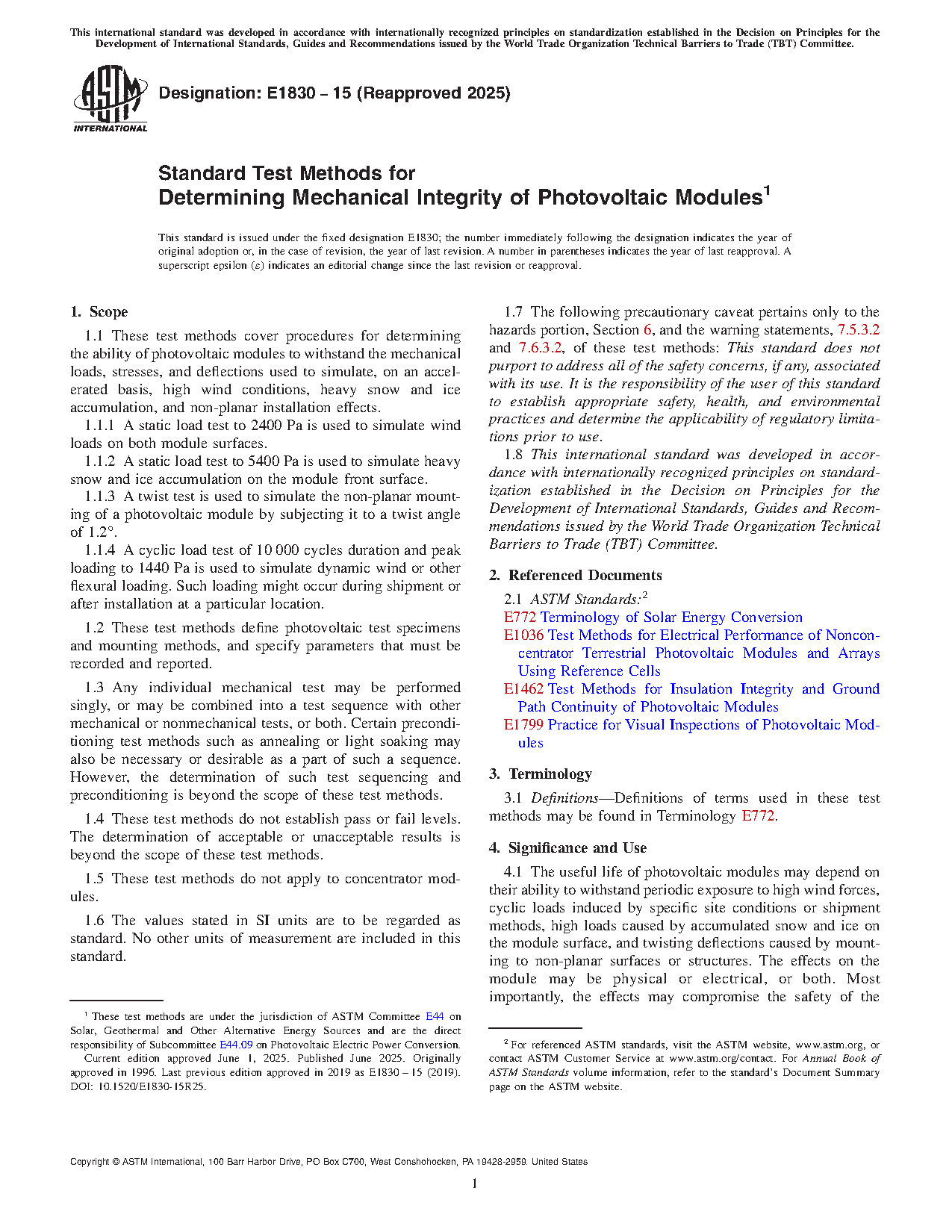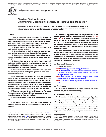 1.1 These test methods cover procedures for determining the ability of photovoltaic modules to withstand the mechanical loads, stresses and deflections used to simulate, on an accelerated basis, high wind conditions, heavy snow and ice accumulation, and non-planar installation effects.