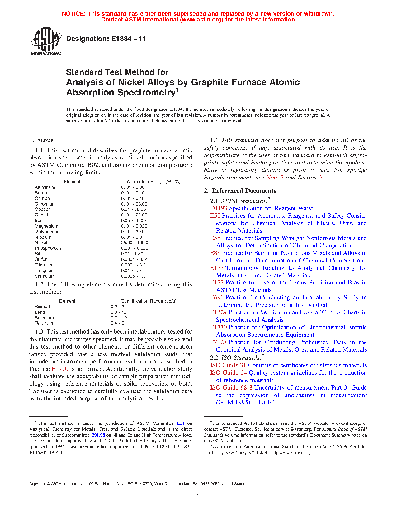 1.1 This test method describes the graphite furnace atomic absorption spectrometric analysis of nickel, such as specified by ASTM Committee B02, and having chemical compositions within the following limits: