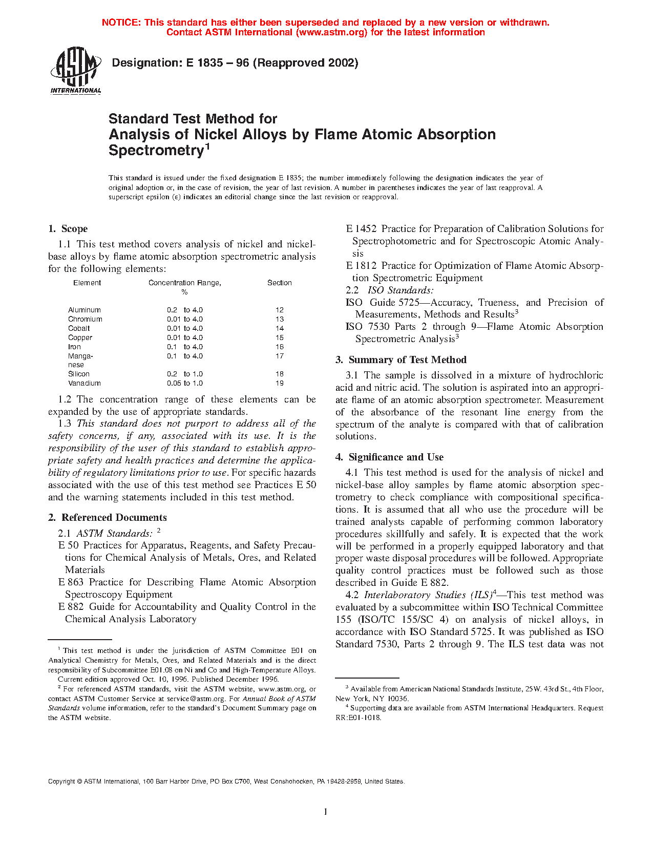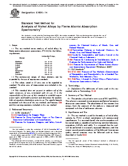 5.1 This test method is used for the analysis of nickel alloy samples by FAAS to check for compliance with compositional specifications. It is assumed that all who use the procedure will be trained analysts capable of performing common laboratory procedures skillfully and safely. It is expected that the work will be performed in a properly equipped laboratory and that proper waste disposal procedures will be followed. Appropriate quality control practices must be followed such as those described in Guide E882.
