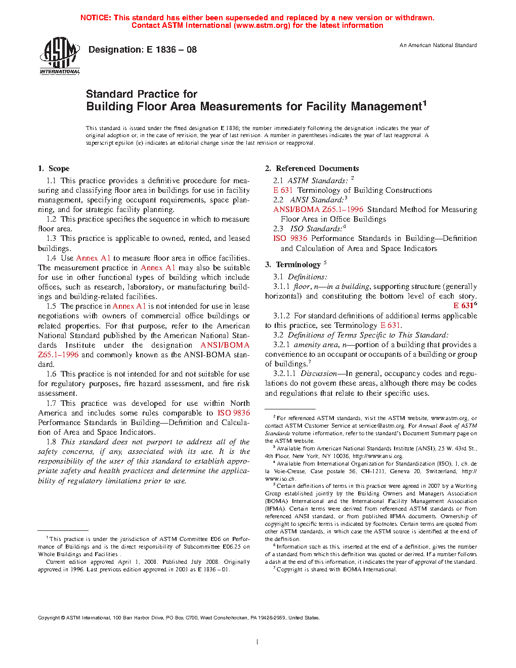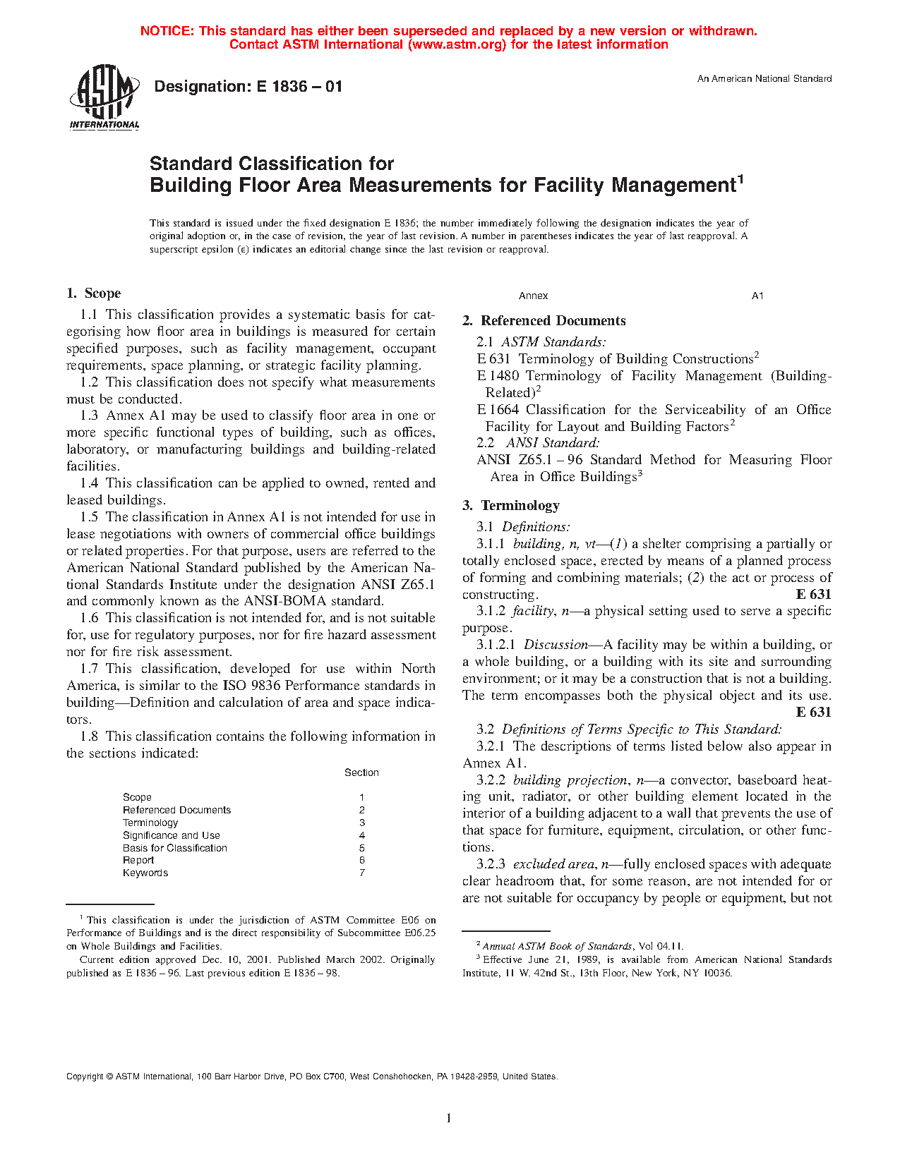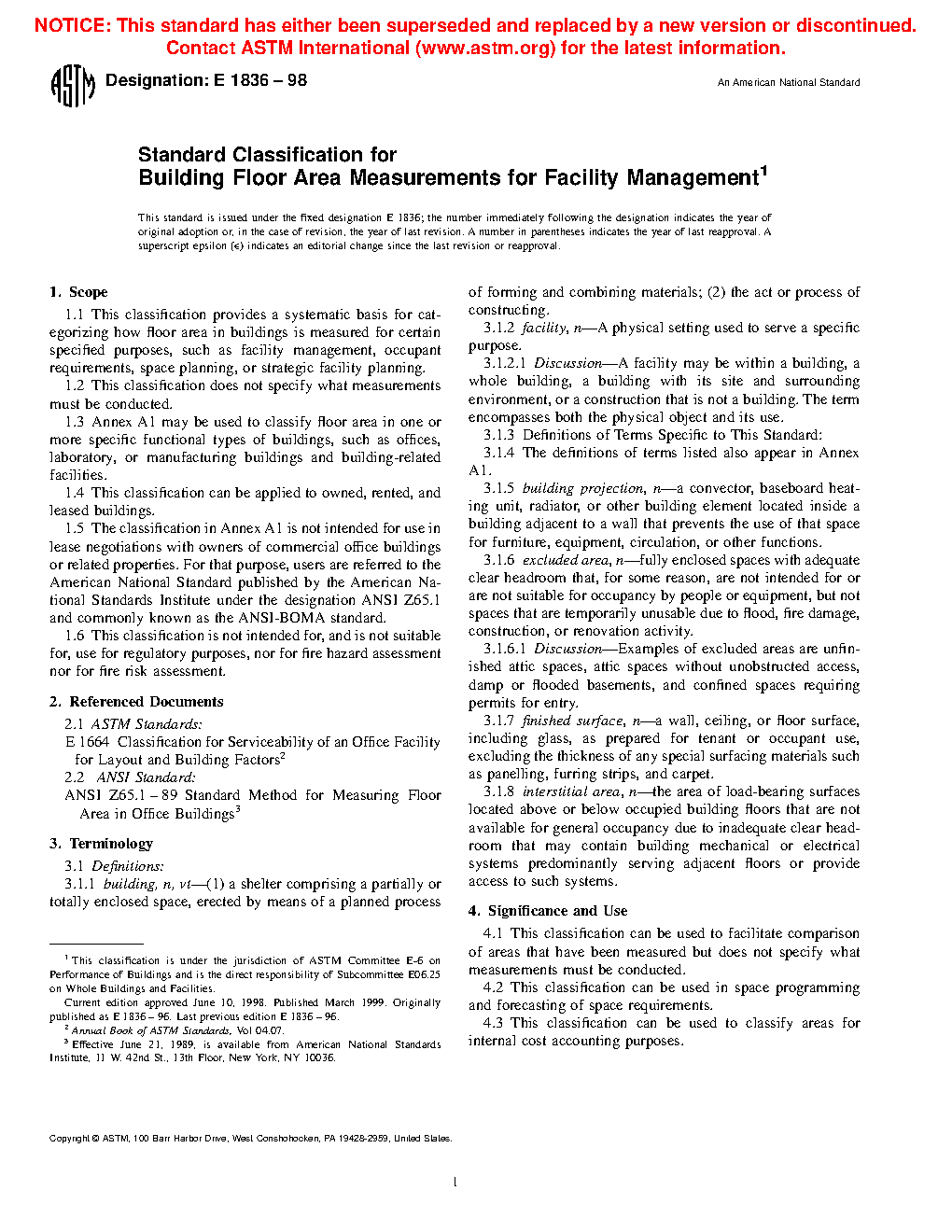 1.5 The classification in Annex A1 is not intended for use in lease negotiations with owners of commercial office buildings or related properties. For that purpose, users are referred to the American National Standard published by the American National Standards Institute under the designation ANSI Z65.1 and commonly known as the ANSI-BOMA standard.